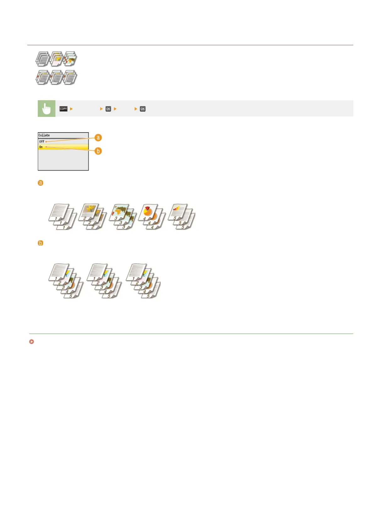 When preparing multiple copies of multi-page documents, set <Collate> to <On> to collate copies in