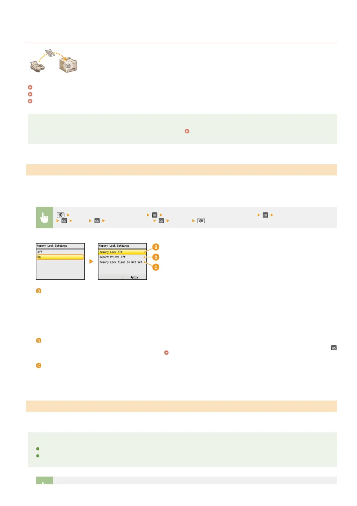 To store received documents into memory, set <Memory Lock Settings> to <On>. You can also specify optional settings such as a