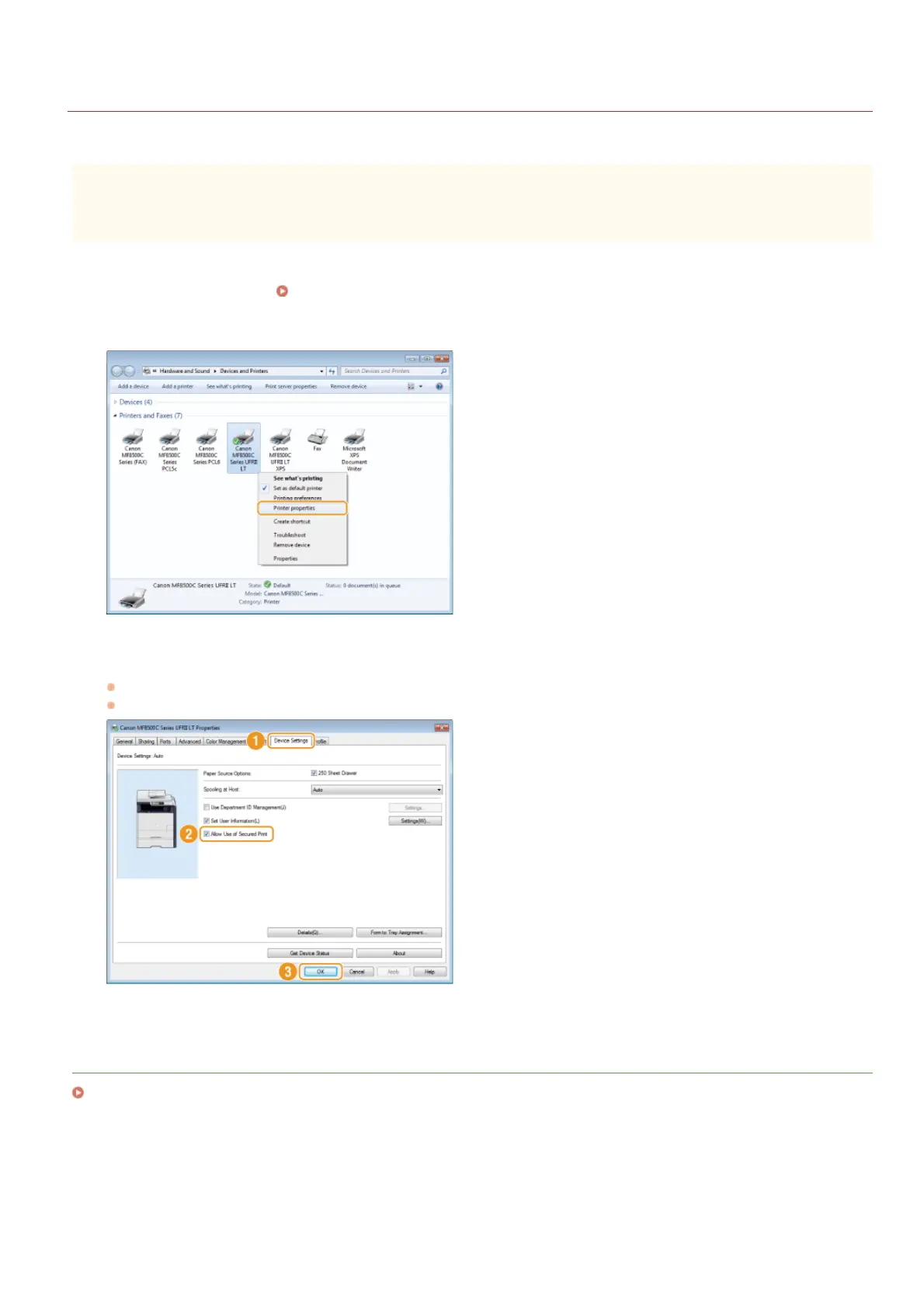 Click the [Device Settings] tab and make sure that the [Allow Use of Secured Print] check box is selected.
