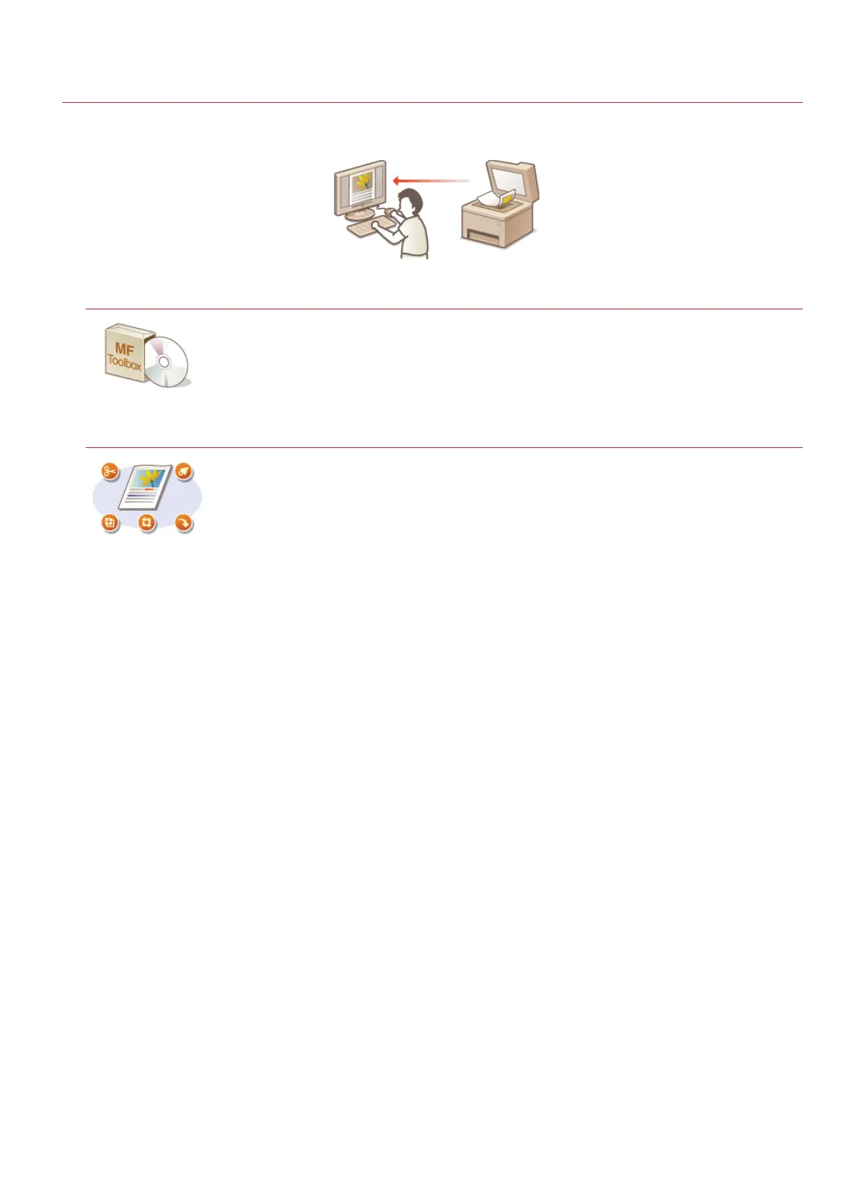 There are two ways to scan from a computer: using MF Toolbox and using an application such as an image-processing or word-