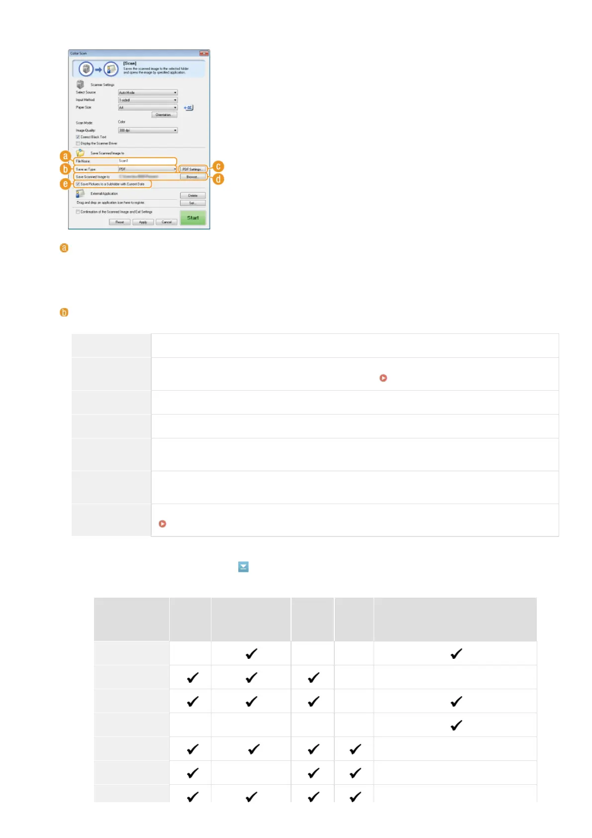 Specify settings for the scanned data, such as the file name, file format (PDF, JPEG, etc.) and save destination.