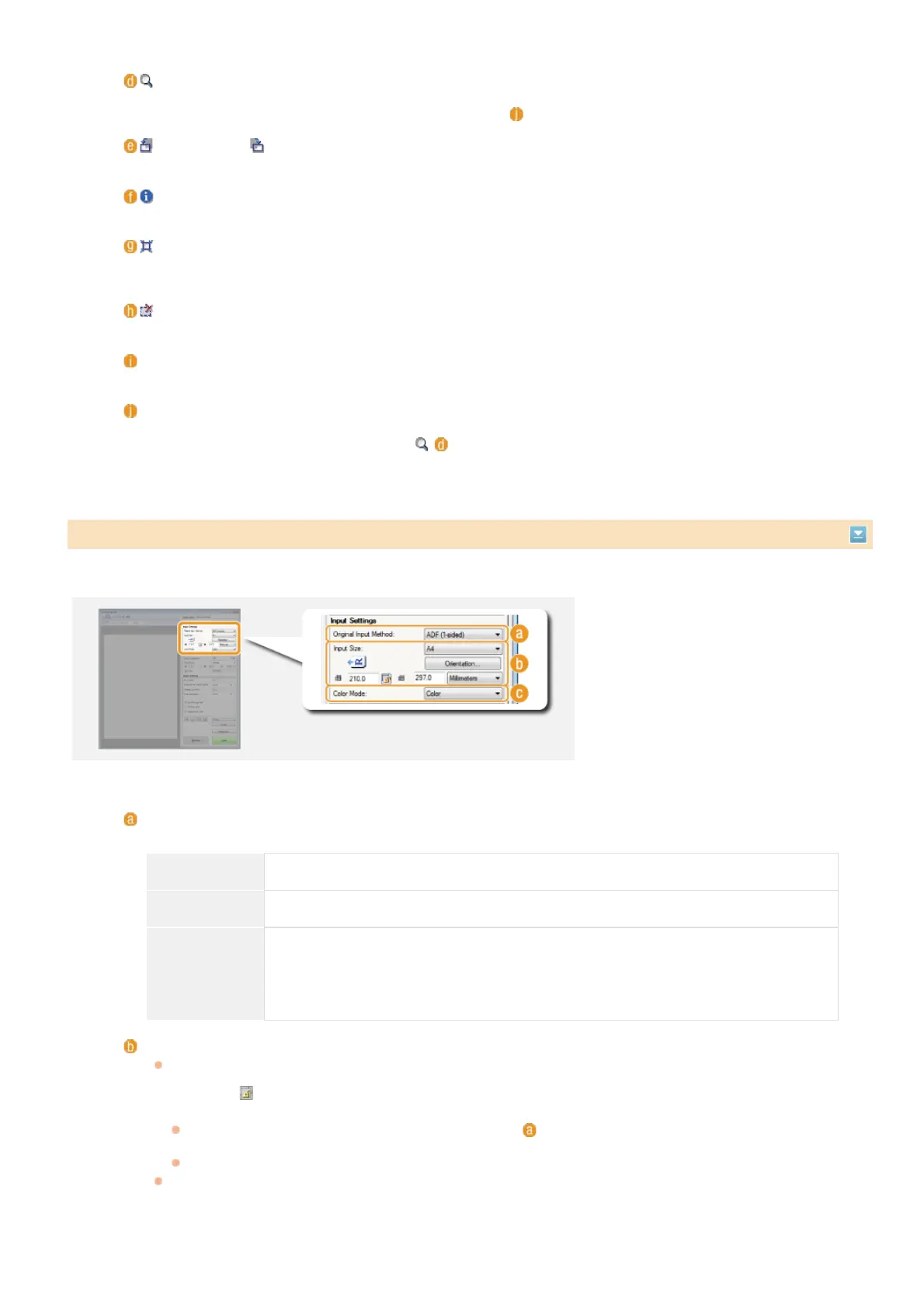 Specify the document input method (the platen glass or feeder), document size, color mode, and other settings.