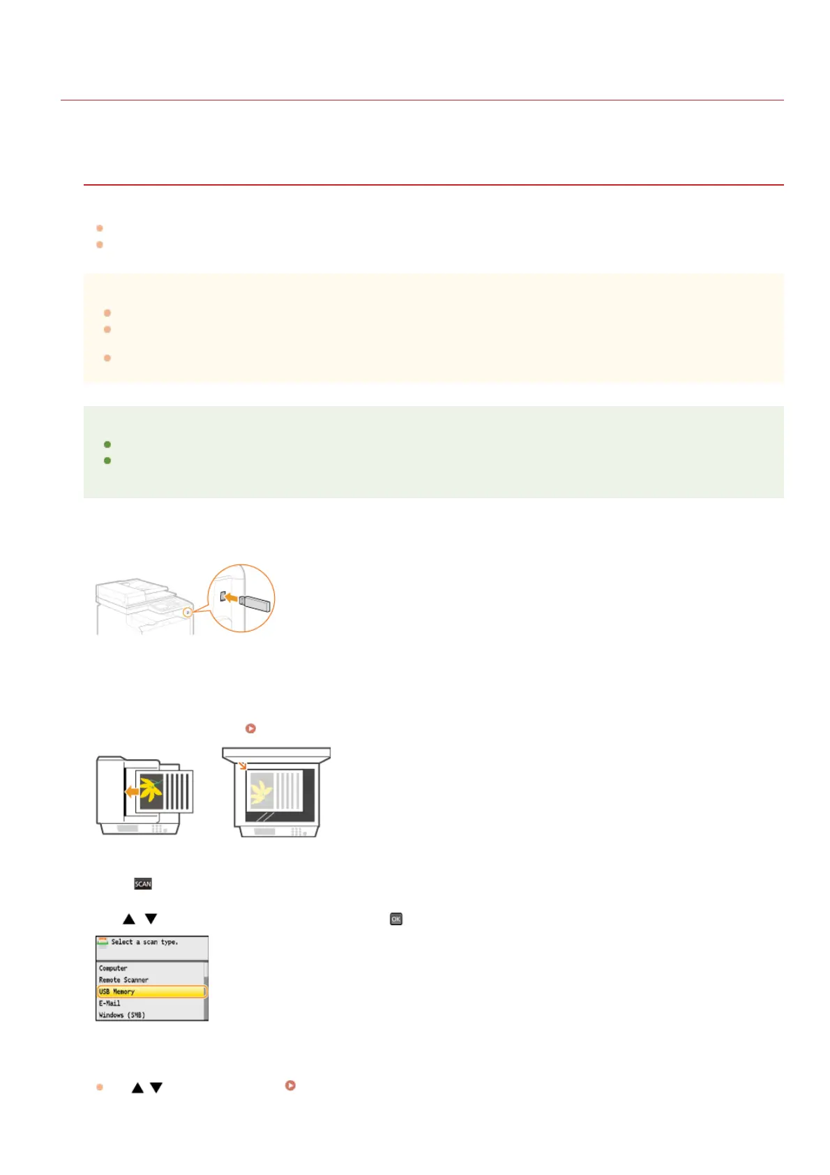This section describes how to scan documents to save directly in a USB memory device connected to the machine. You can save the