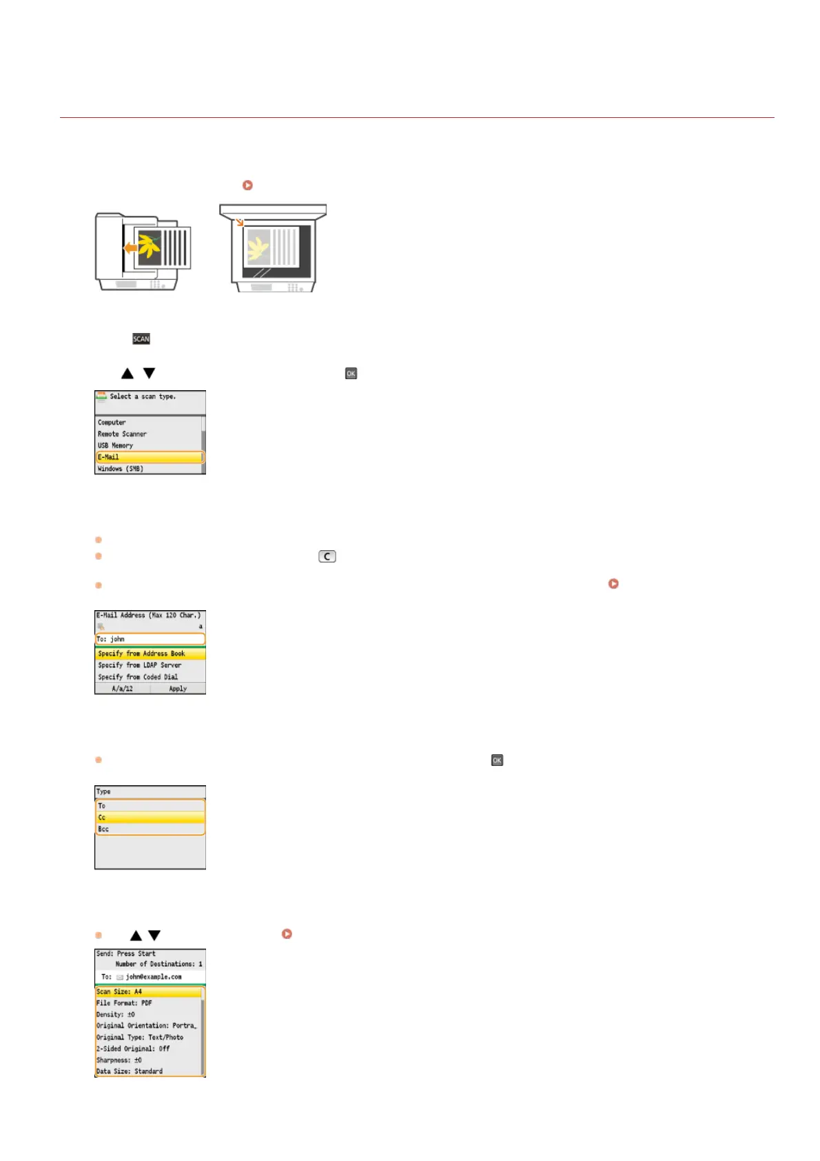 First, select from <To>, <Cc>, or <Bcc> as a destination type, and press , and then specify destinations. Use the Address