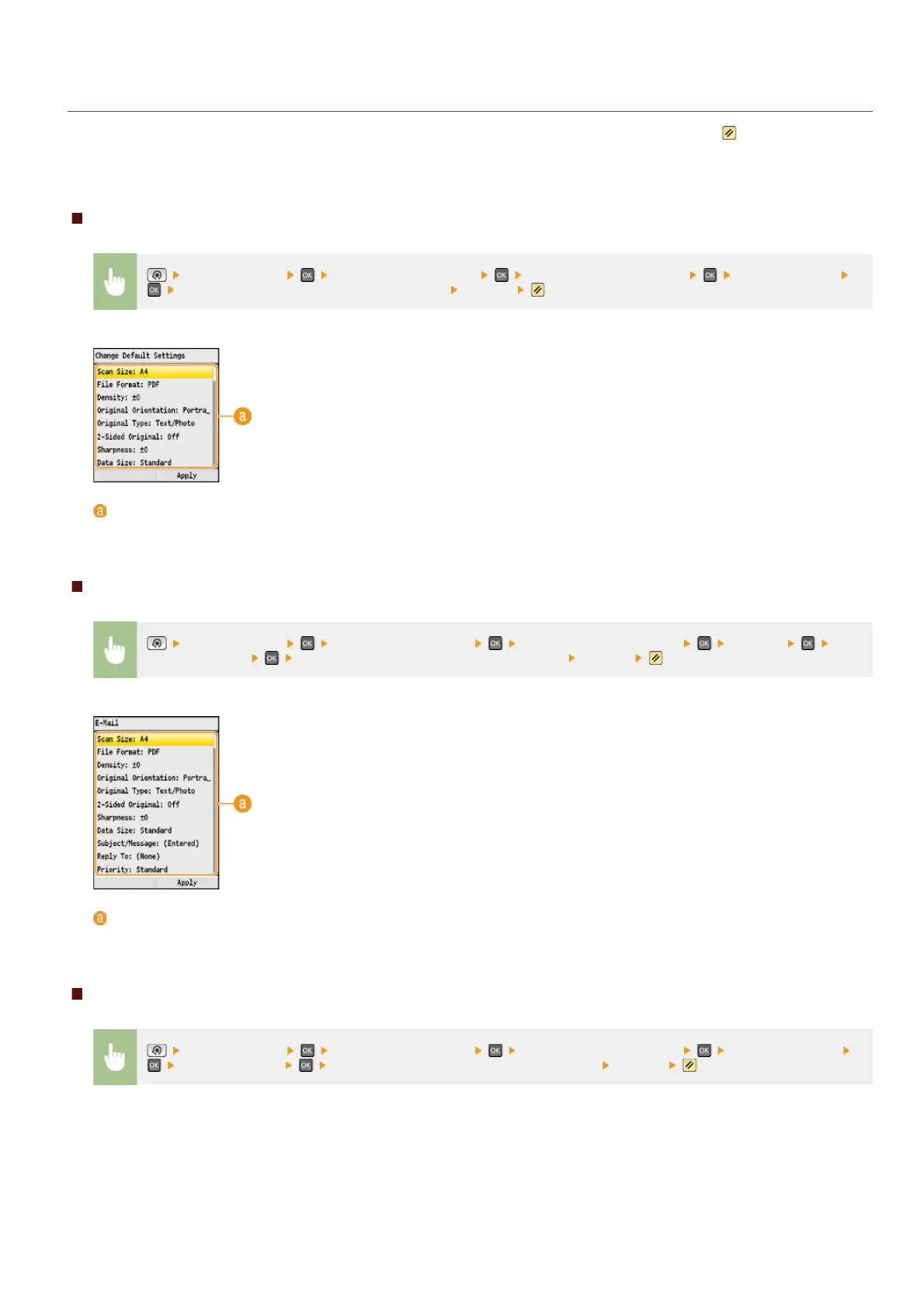 <Scan Settings> <USB Memory Settings> <Change Default Settings> Select the setting