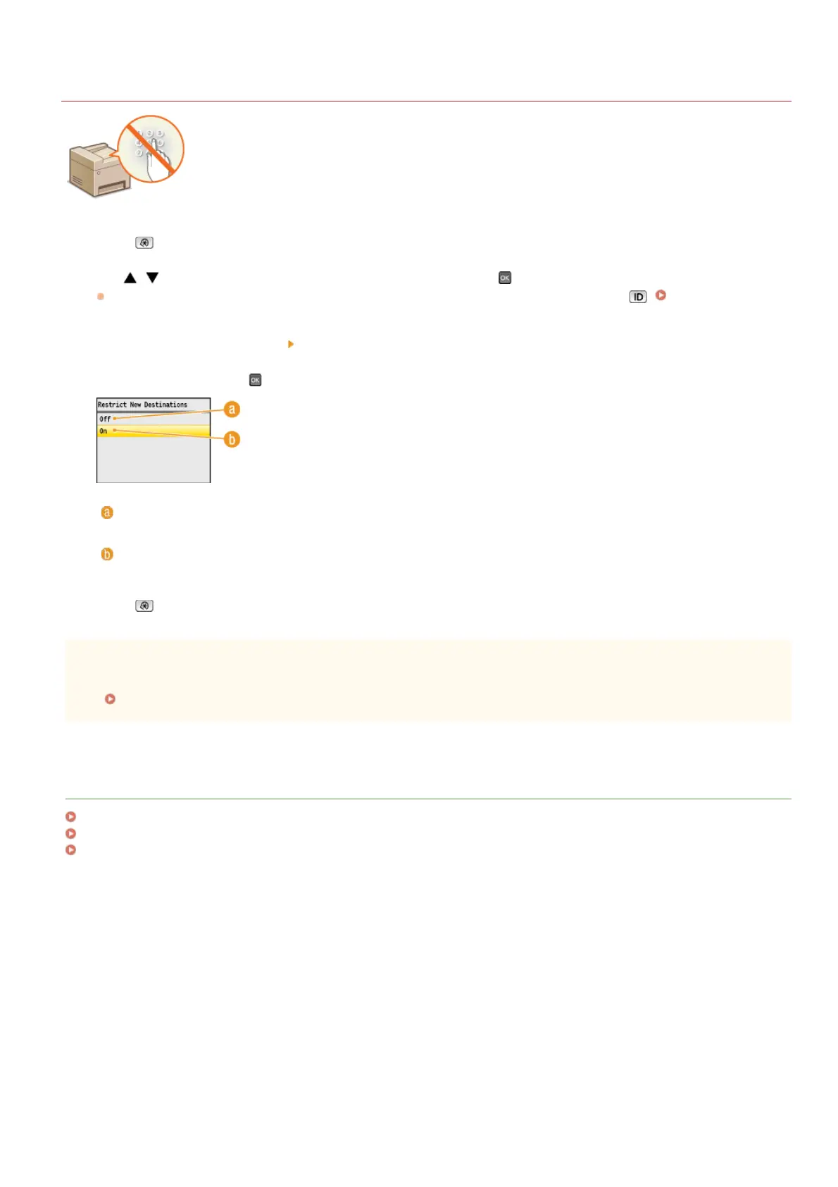 is enabled, the machine prohibits users from entering destinations using the numeric keys, adding new entries