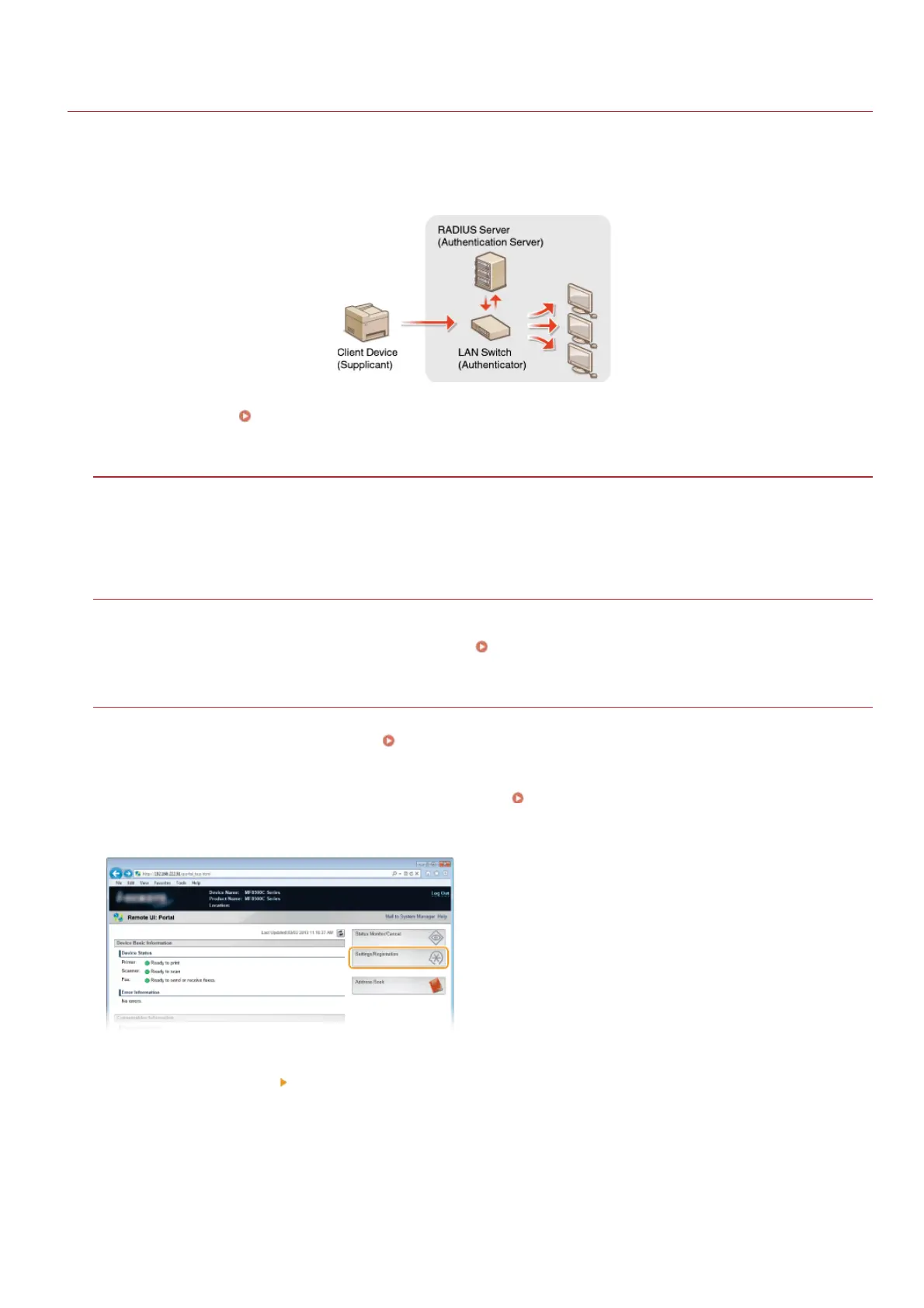 The machine can connect to an 802.1X network as a client device. A typical 802.1X network consists of a RADIUS server (authentication
