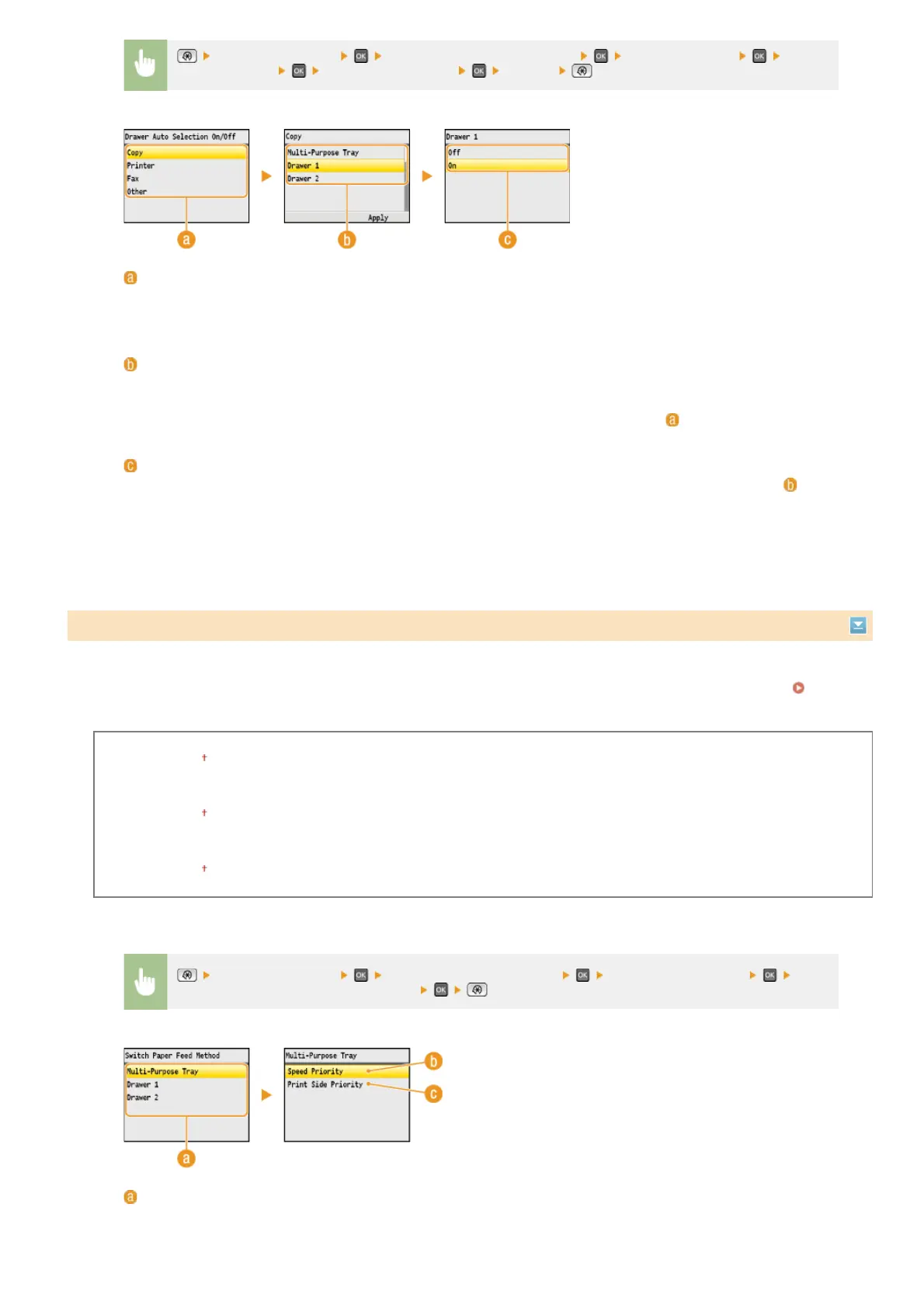 <Common Settings> <Drawer Auto Selection On/Off> Select the function Select