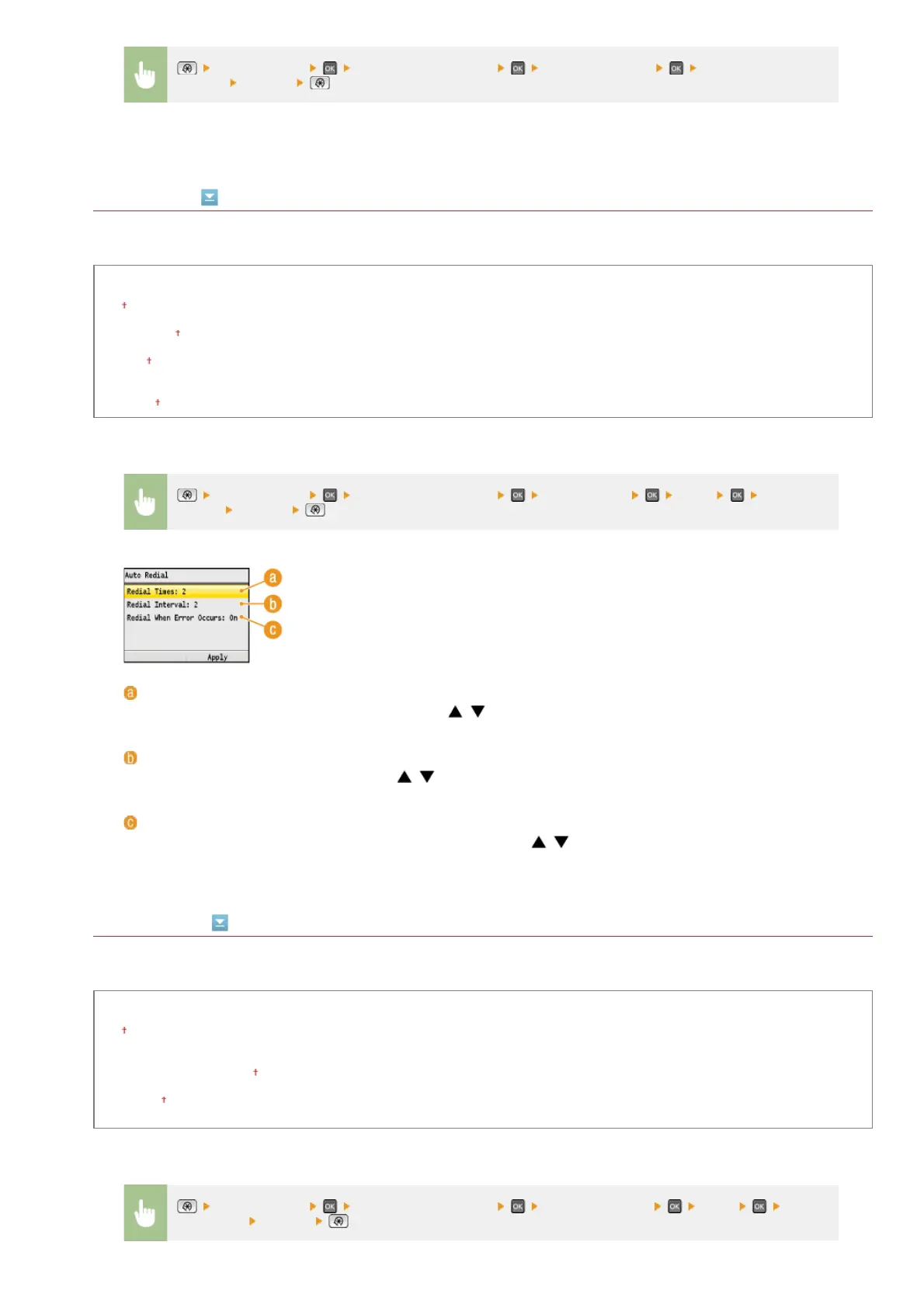 <Fax Settings> <TX Function Settings> <Auto Redial> <On> Specify the