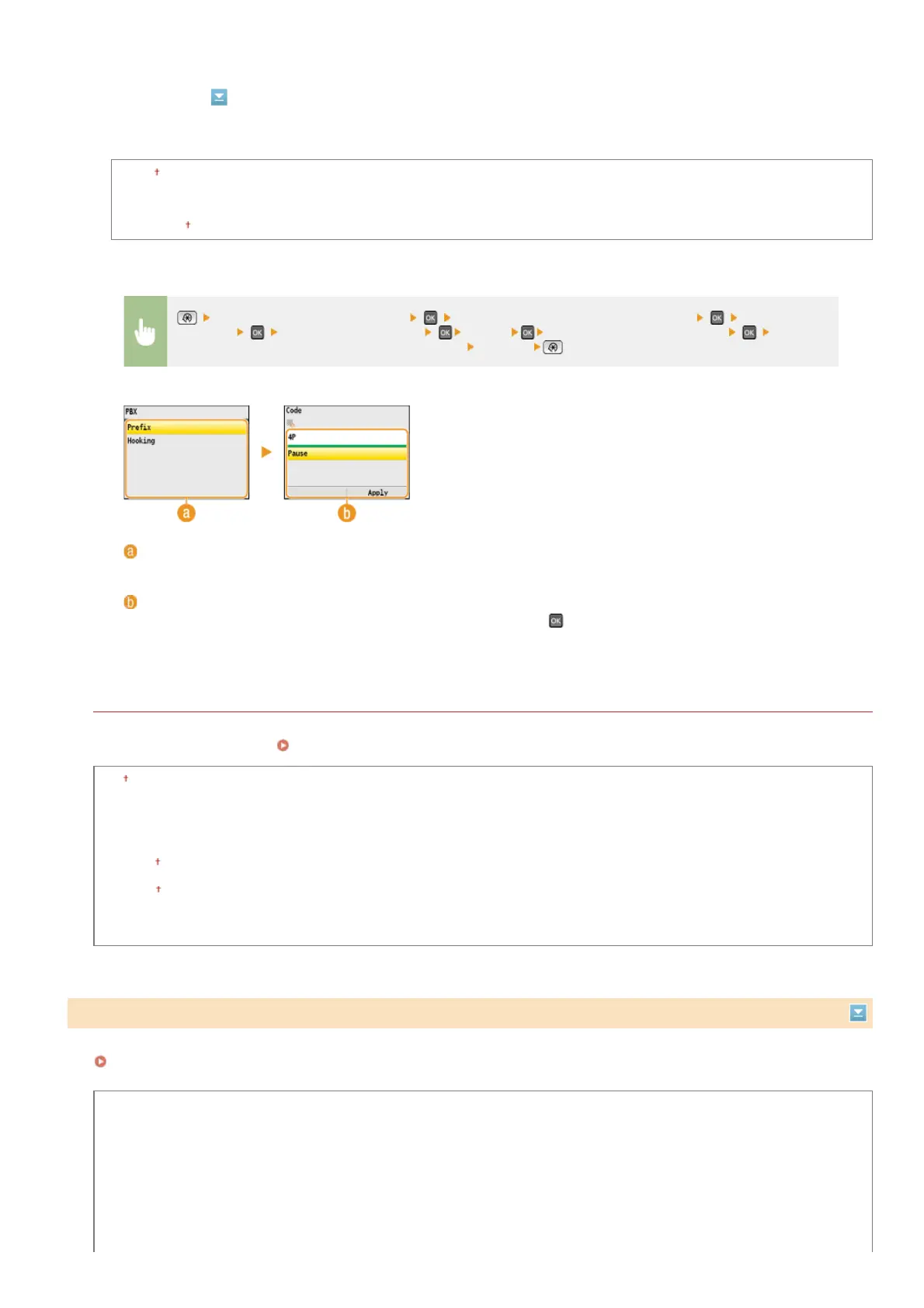 Select <R-Key Setting> <PBX> Select <Prefix> or <Hooking> Enter the