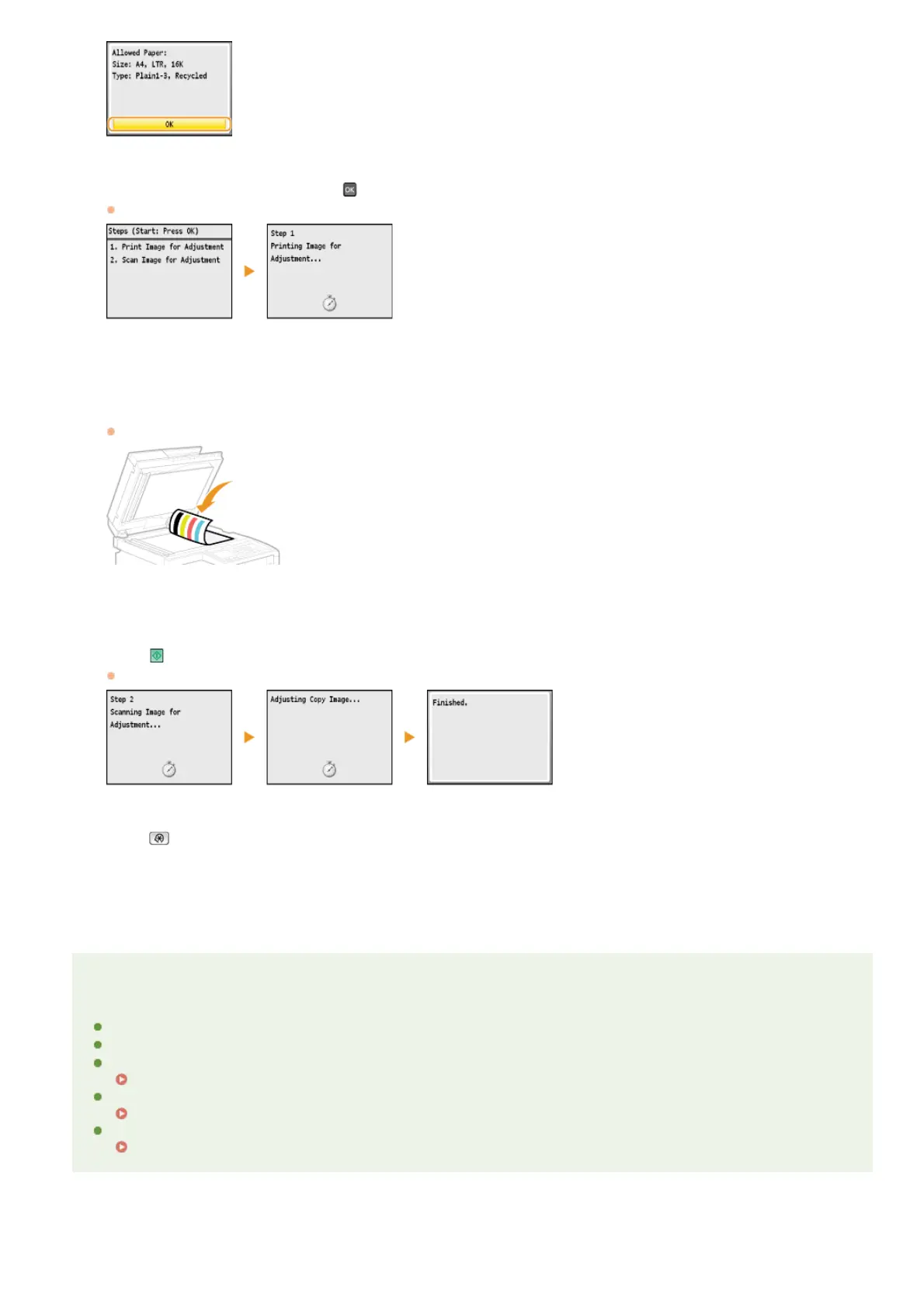 The adjustment image is scanned and adjustment starts. In approximately 1 to 2 minutes, the adjustment is finished.