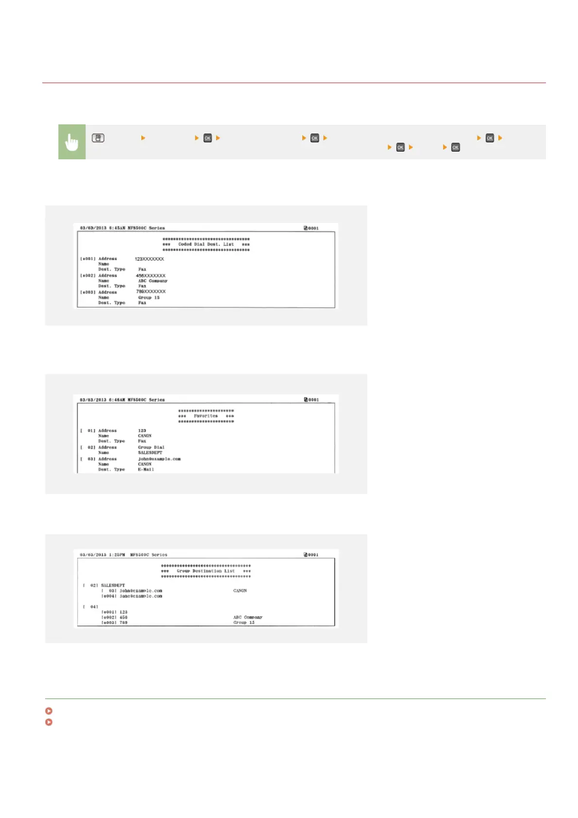 You can check the list of destinations registered in the Address Book as <Coded Dial>, <Favorites>, and <Group Dial> by printing an