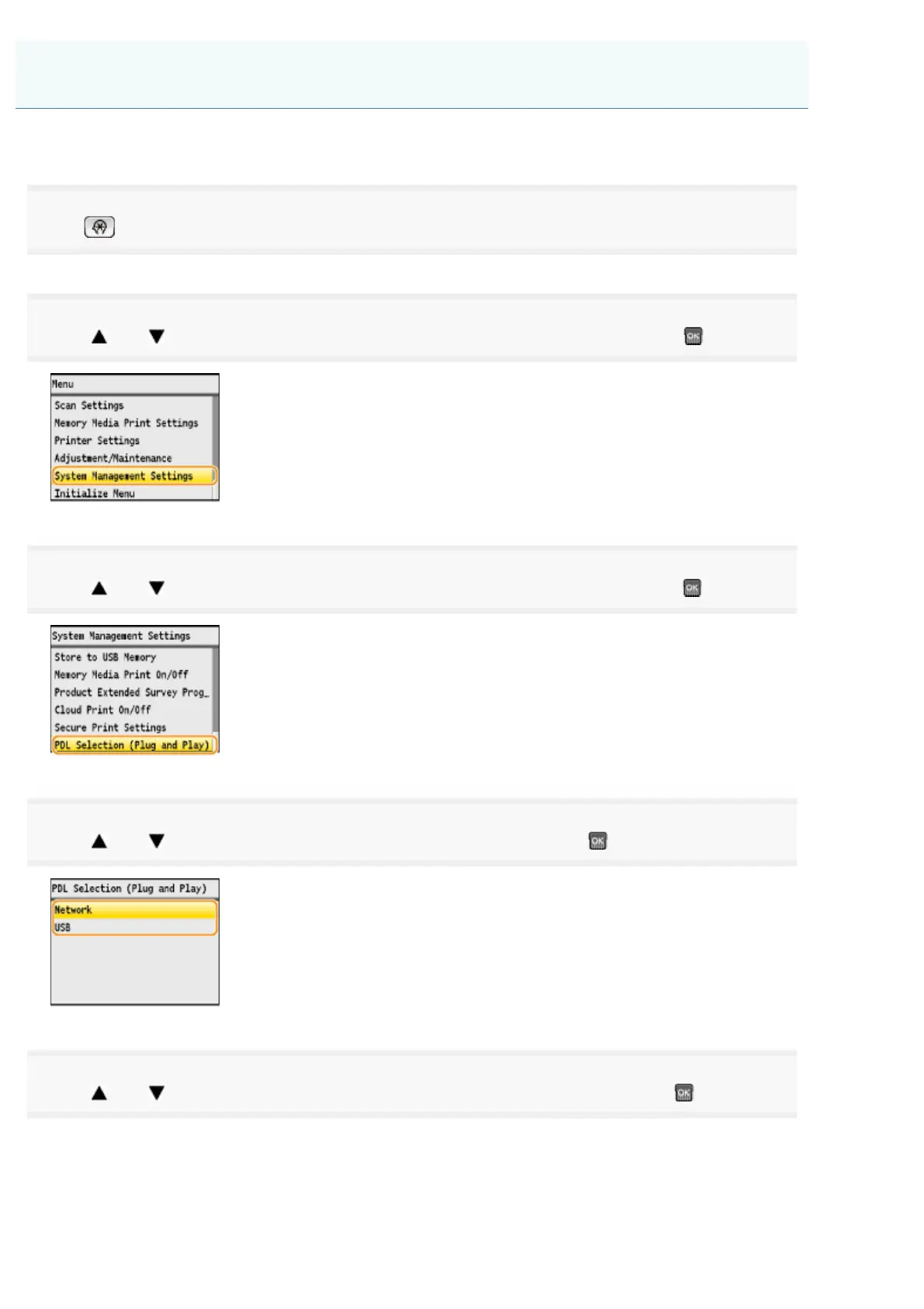 Press [ ] or [ ] to highlight <PDL Selection (Plug and Play)>, and then press .