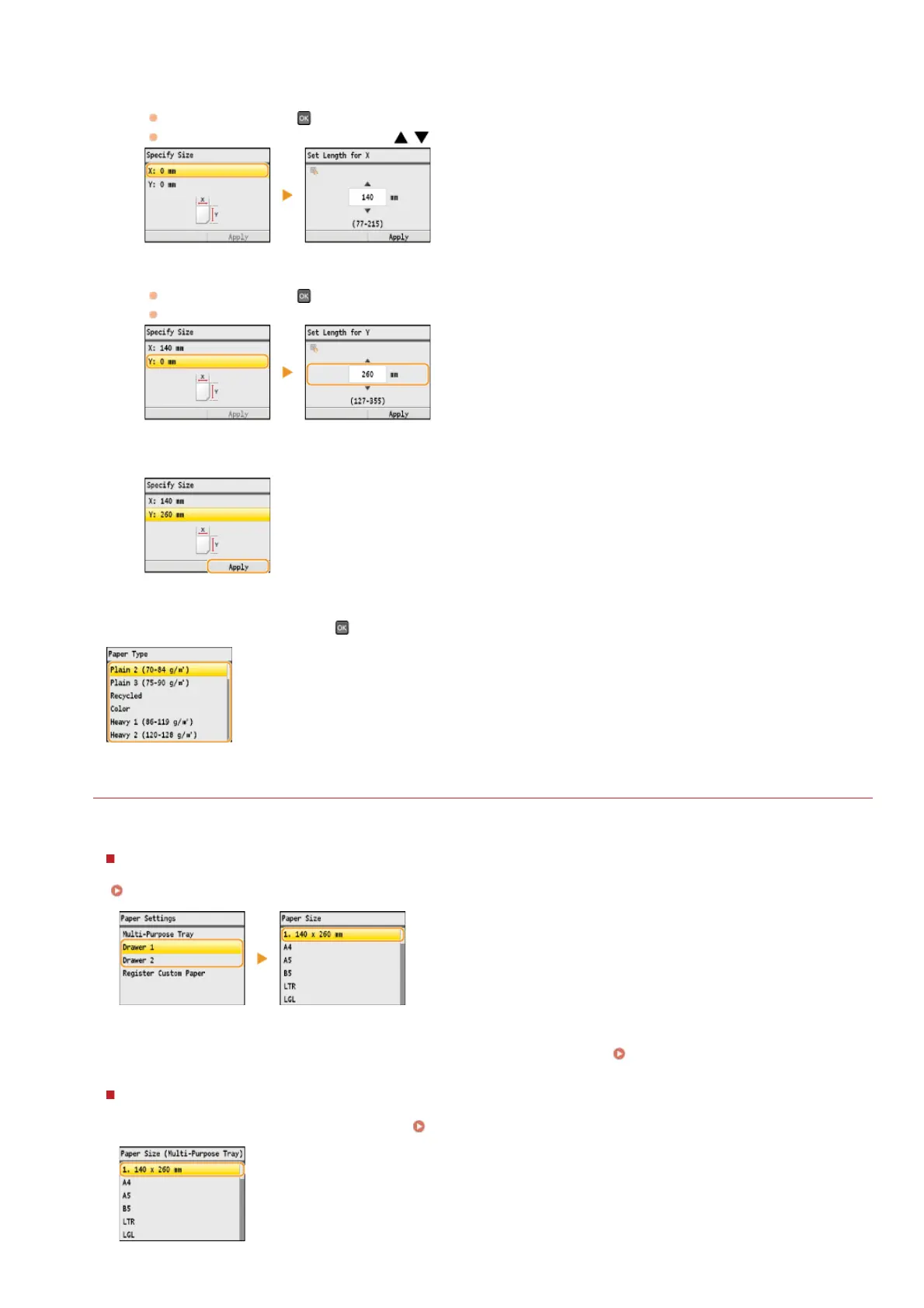 The paper sizes that are registered in the procedure above are displayed on the screen for selecting the paper size.