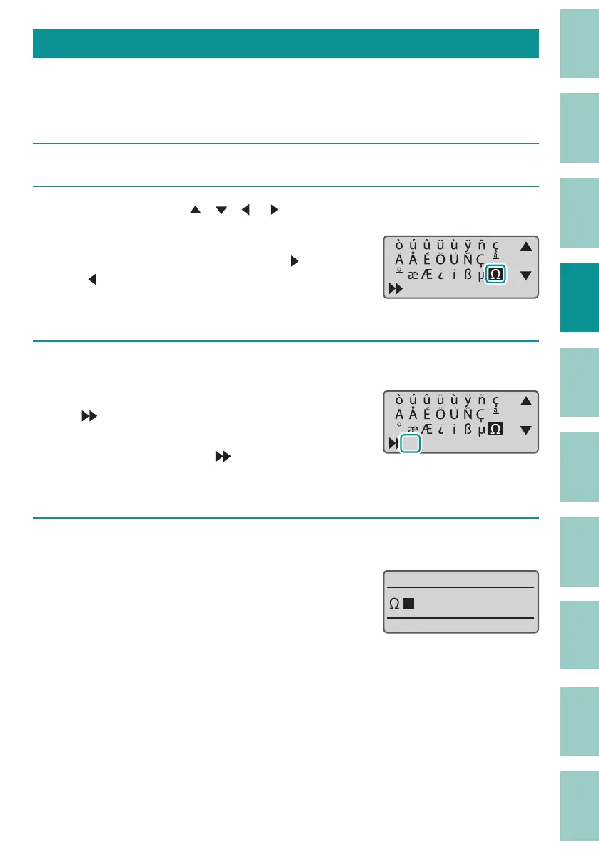 Use the arrow keys ([ ], [ ], [ ], [ ]) to select "Ω" from the list of symbols.