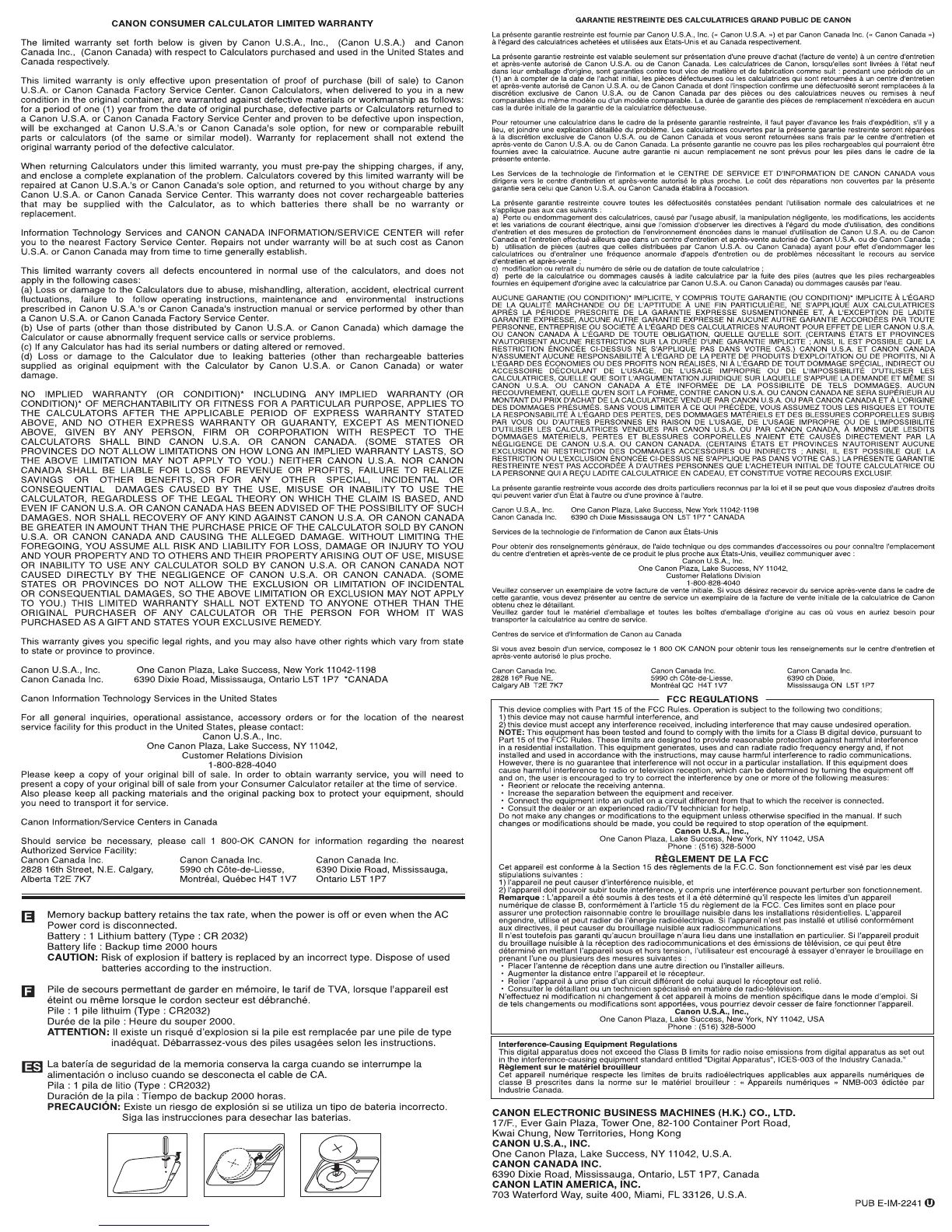 Canon MP21DX - Safety and Regulatory Information; Limited Warranty Information; FCC Compliance Statement; Perchlorate Material Handling