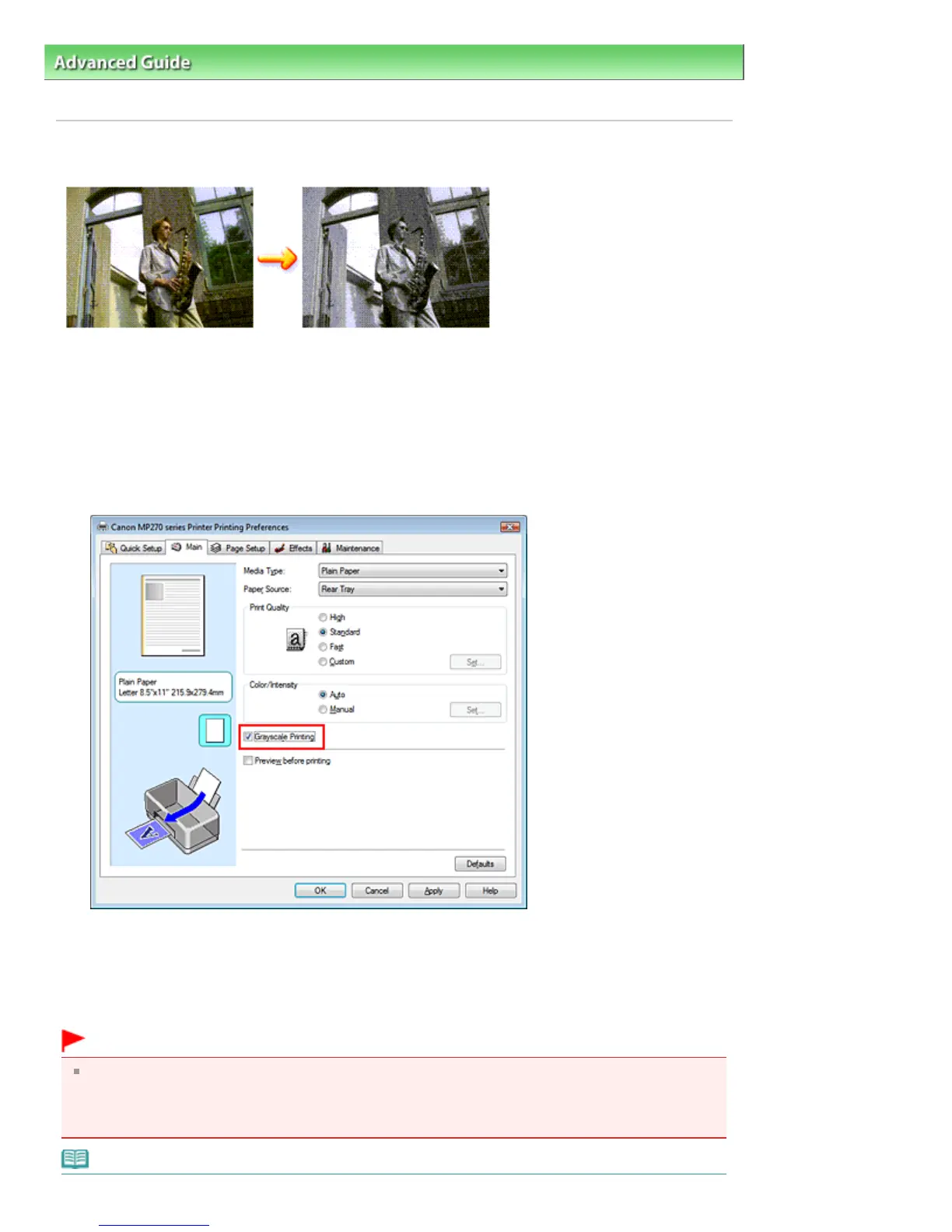 When the Grayscale Printing check box is checked, the printer driver processes image data as