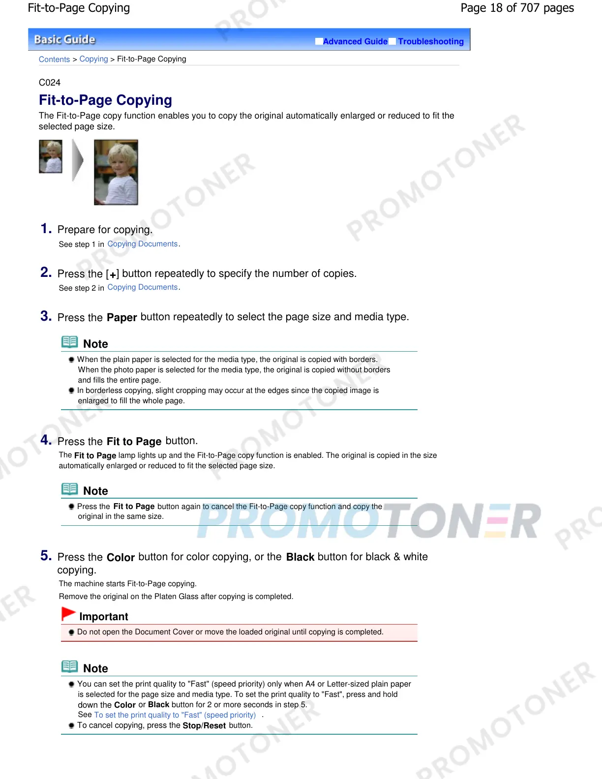 lamp lights up and the Fit-to-Page copy function is enabled. The original is copied in the size