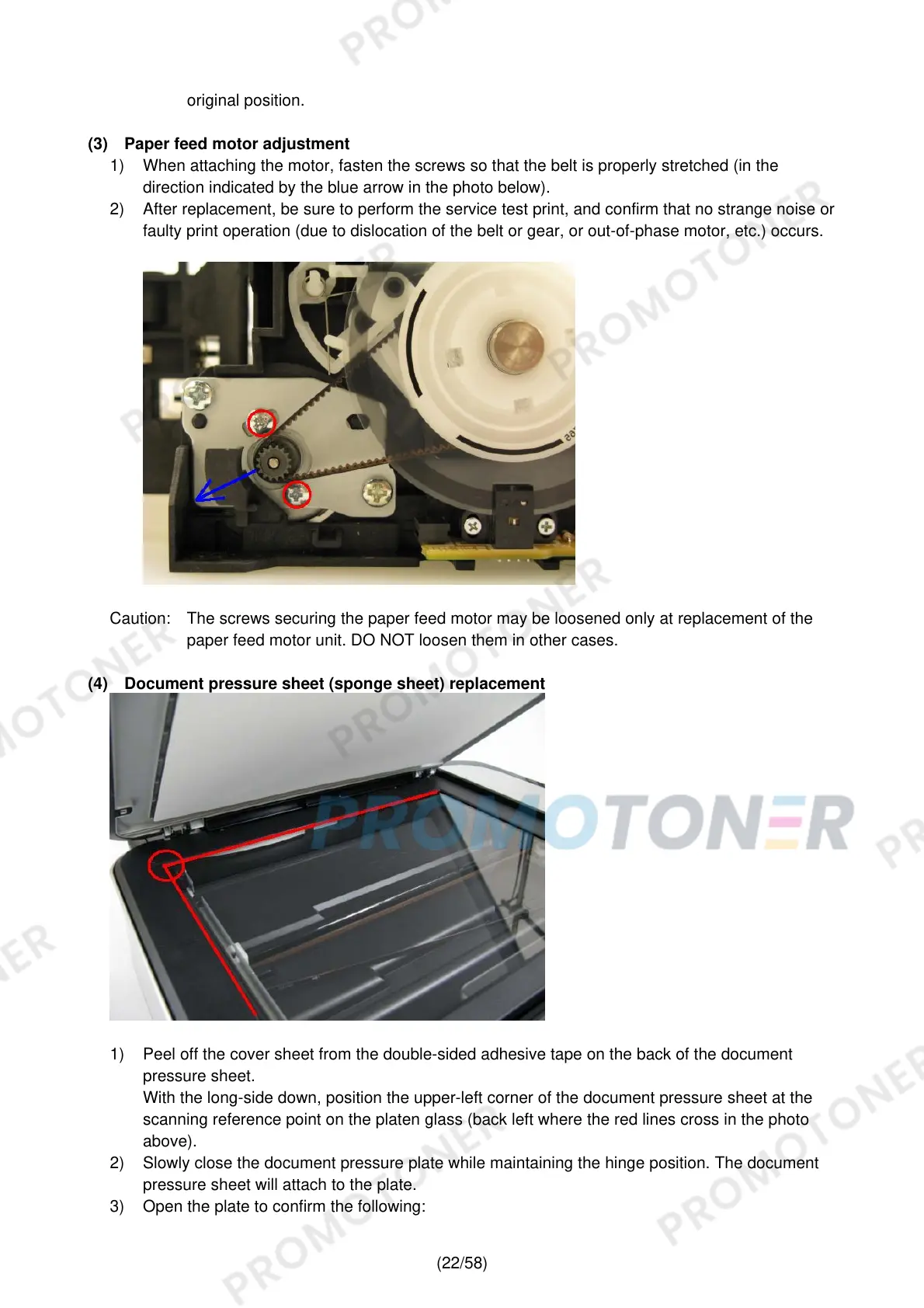Caution: The screws securing the paper feed motor may be loosened only at replacement of the
