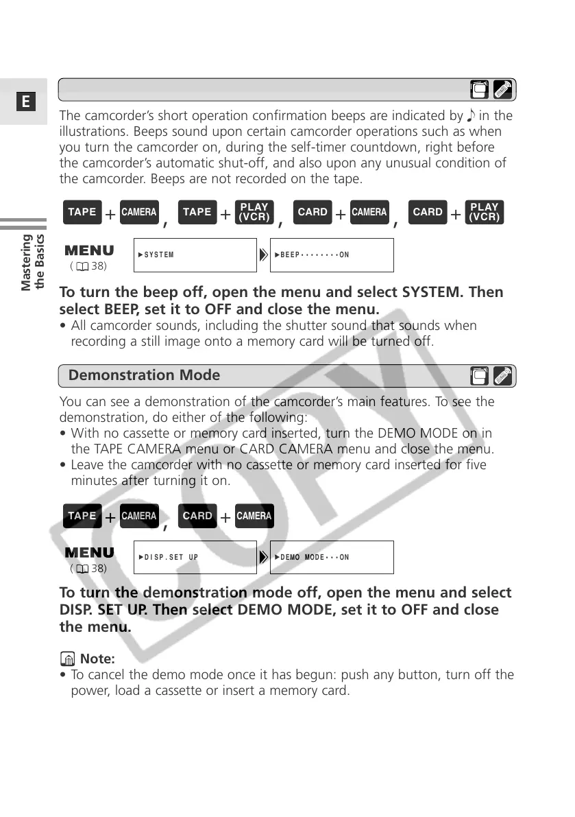 The camcorder’s short operation confirmation beeps are indicated by ` in the