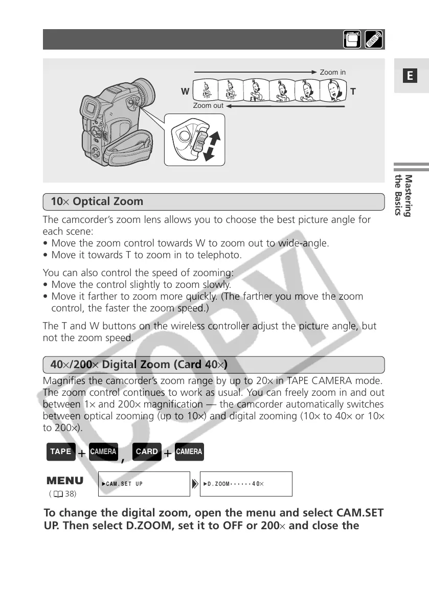 Magnifies the camcorder’s zoom range by up to 20× in TAPE CAMERA mode.