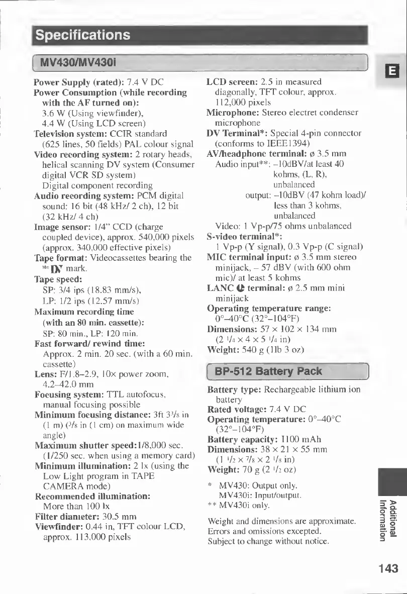 Canon MV430 - Specifications