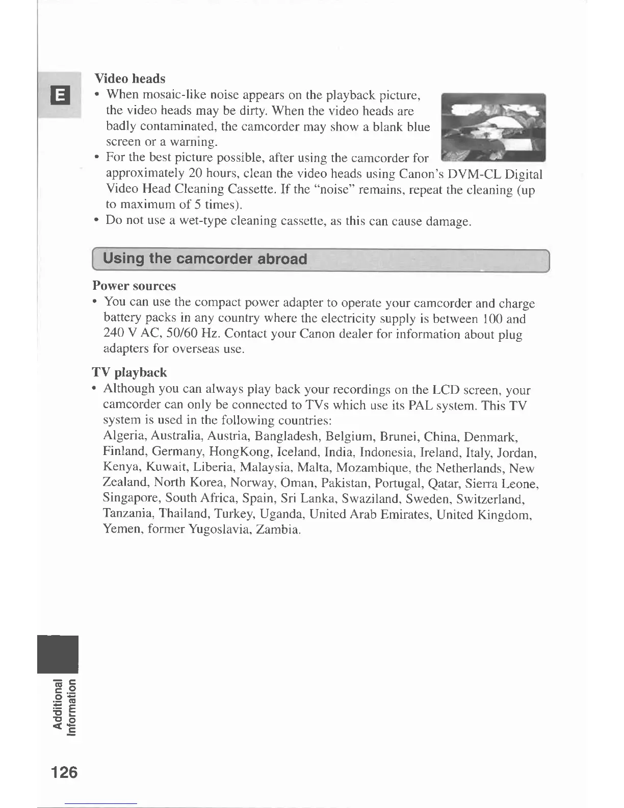 Canon MV430 - Using the Camcorder Abroad; Video Heads; Power Sources; TV Playback