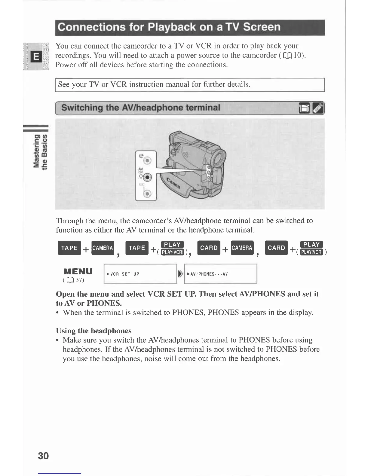 Canon MV430 - Connections for Playback on a TV Screen; Switching the Av;Headphone Terminal