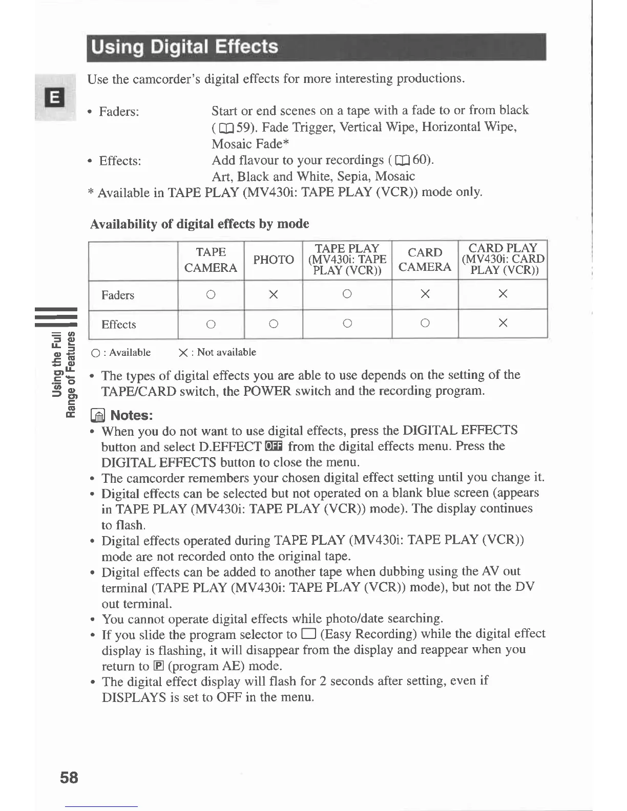 Canon MV430 - Using Digital Effects; Availability of Digital Effects by Mode