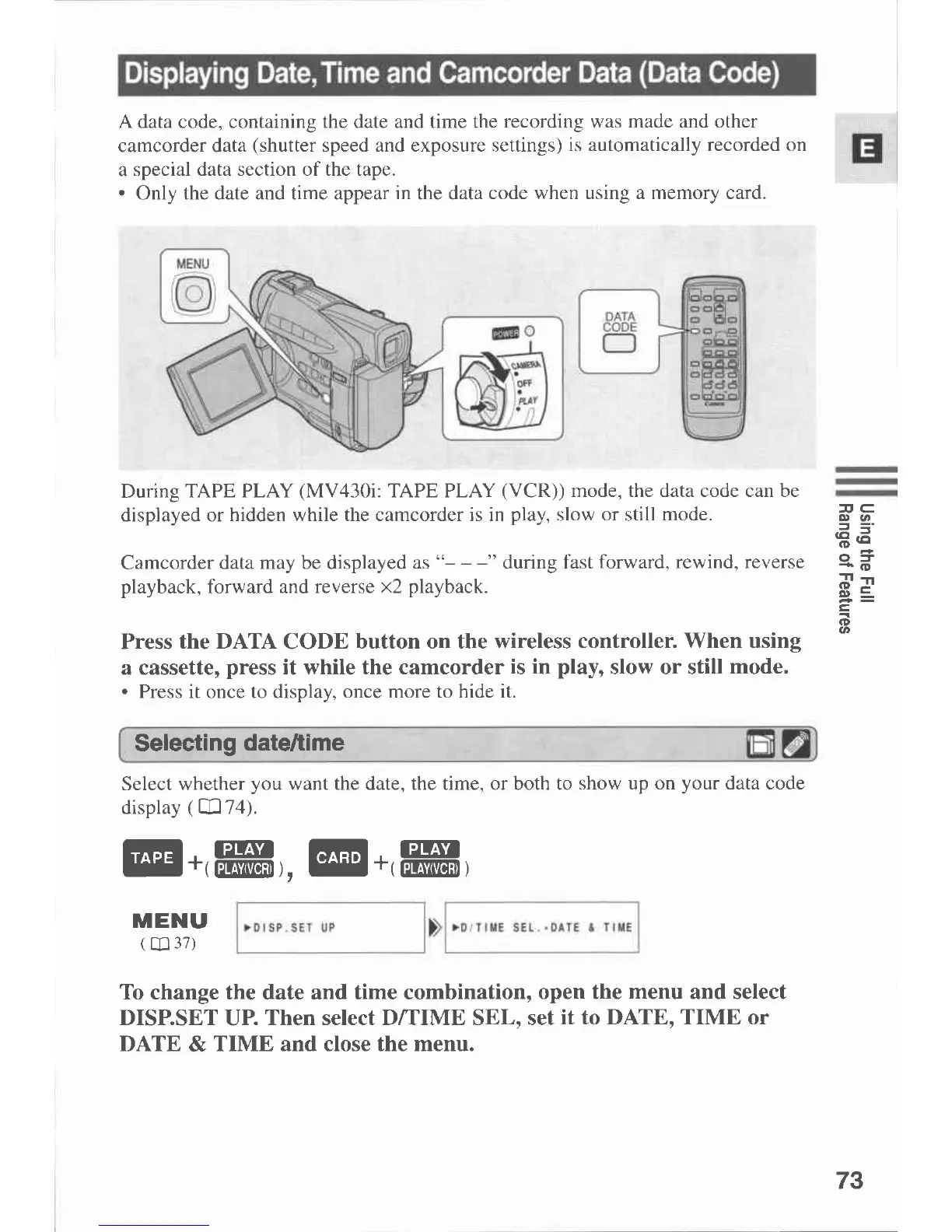 Canon MV430 - Displaying Date, Time and Camcorder Data; Selecting Date;Time