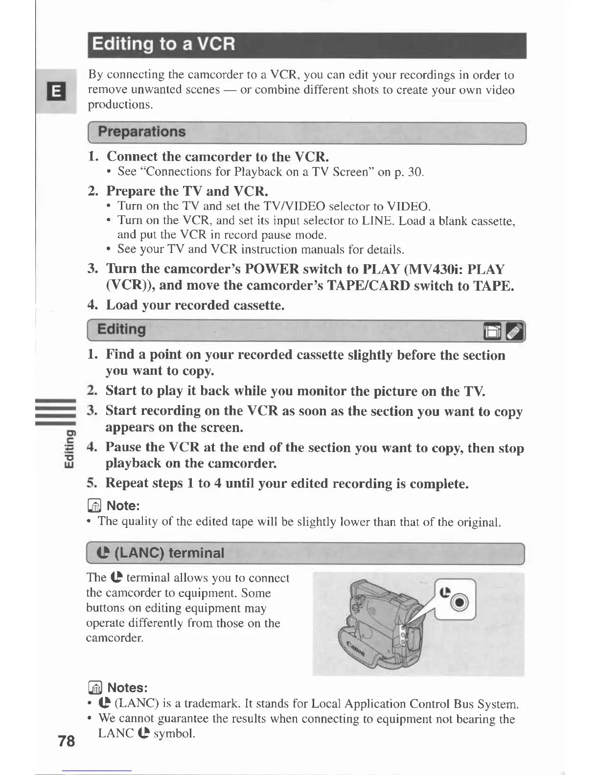 Canon MV430 - Editing to a VCR; Preparations; Editing; Lanc Terminal