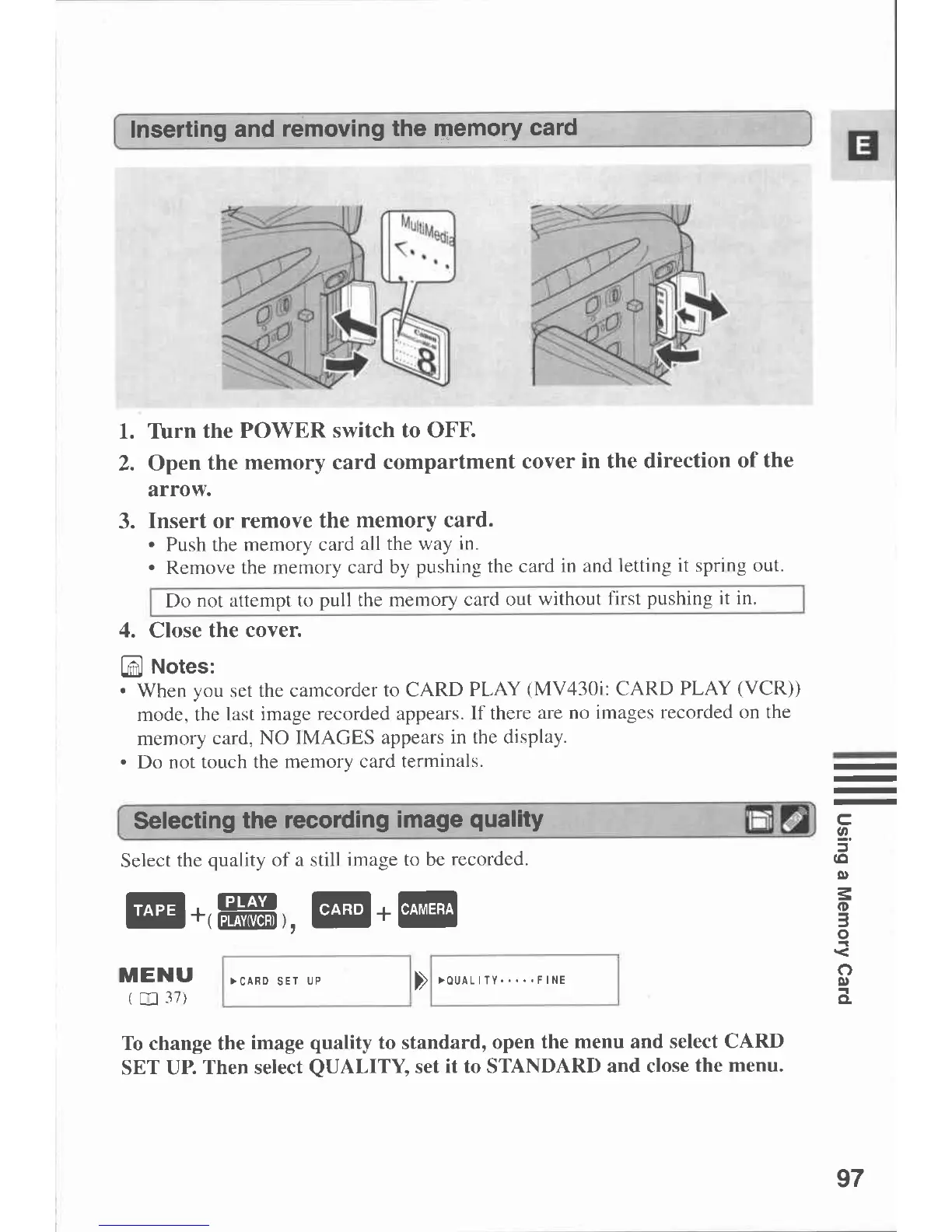 Canon MV430 - Inserting and Removing the Memory Card; Selecting the Recording Image Quality