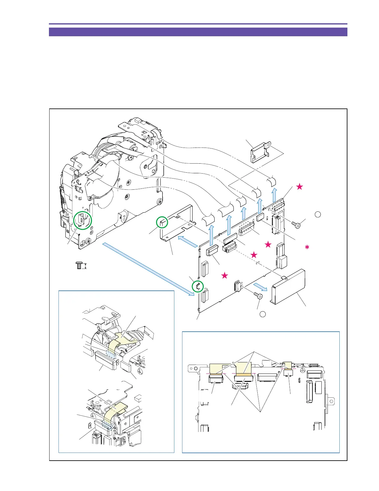 (2) Insert flexible cables into CN302, CN303 and CN2000 according to the flexible cable insertion line on the MAIN P.C.B. as