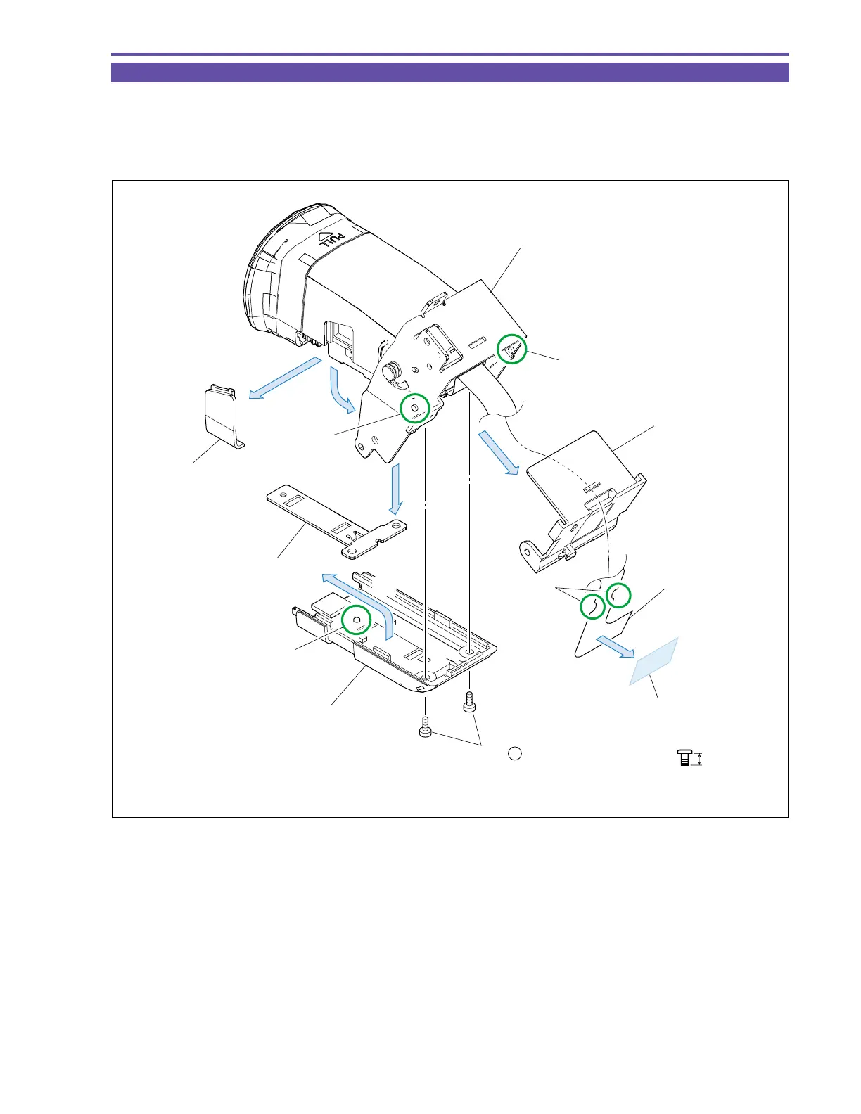 (2) Remove the UL Tape, disengage the dowels A and B, separate the groove part C of CVF FPC, and detach the FPC Holder.