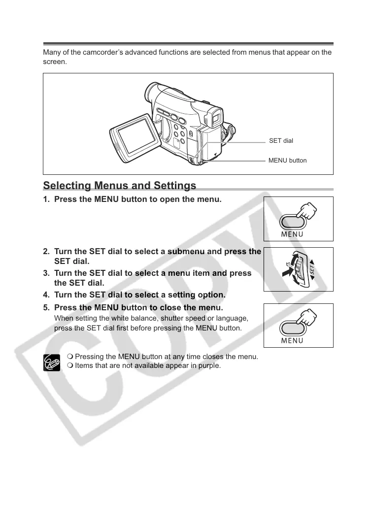 Many of the camcorder’s advanced functions are selected from menus that appear on the
