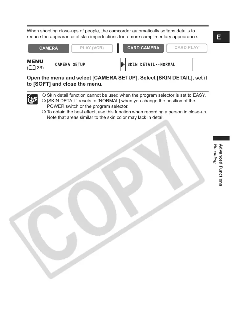 Open the menu and select [CAMERA SETUP]. Select [SKIN DETAIL], set it