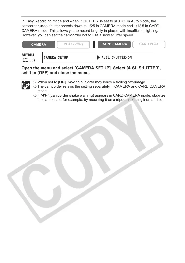 camcorder uses shutter speeds down to 1/25 in CAMERA mode and 1/12.5 in CARD