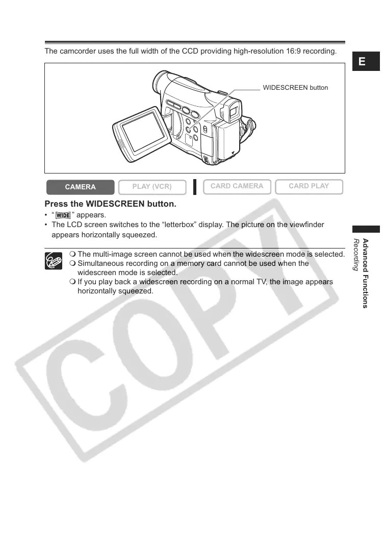 • The LCD screen switches to the “letterbox” display. The picture on the viewfinder