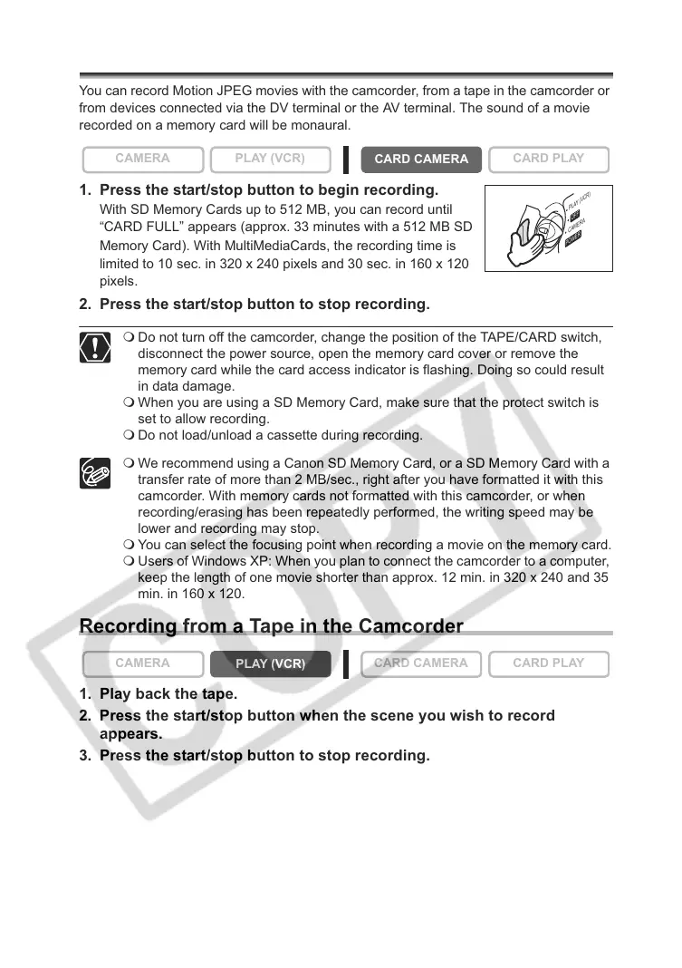 You can record Motion JPEG movies with the camcorder, from a tape in the camcorder or