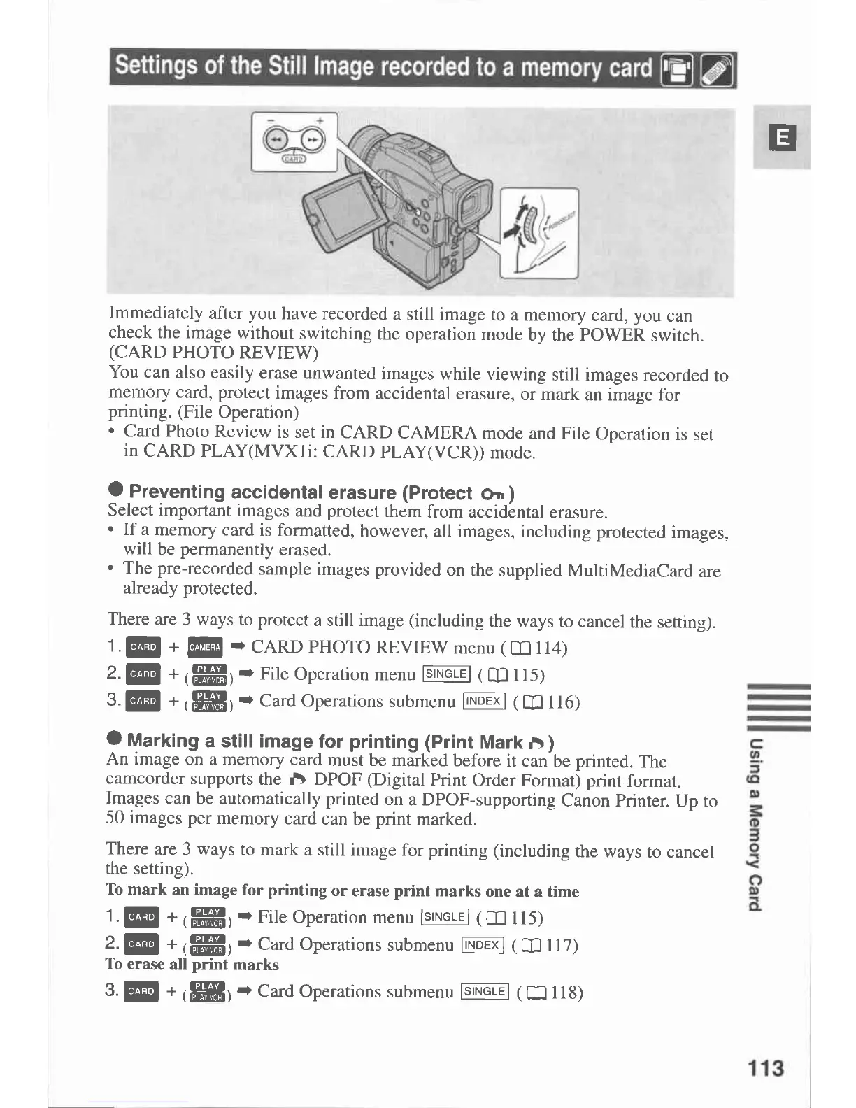 Canon MVX 1 - Settings of the Still Image Recorded to a Memory Card; Preventing Accidental Erasure; Marking a Still for Printing