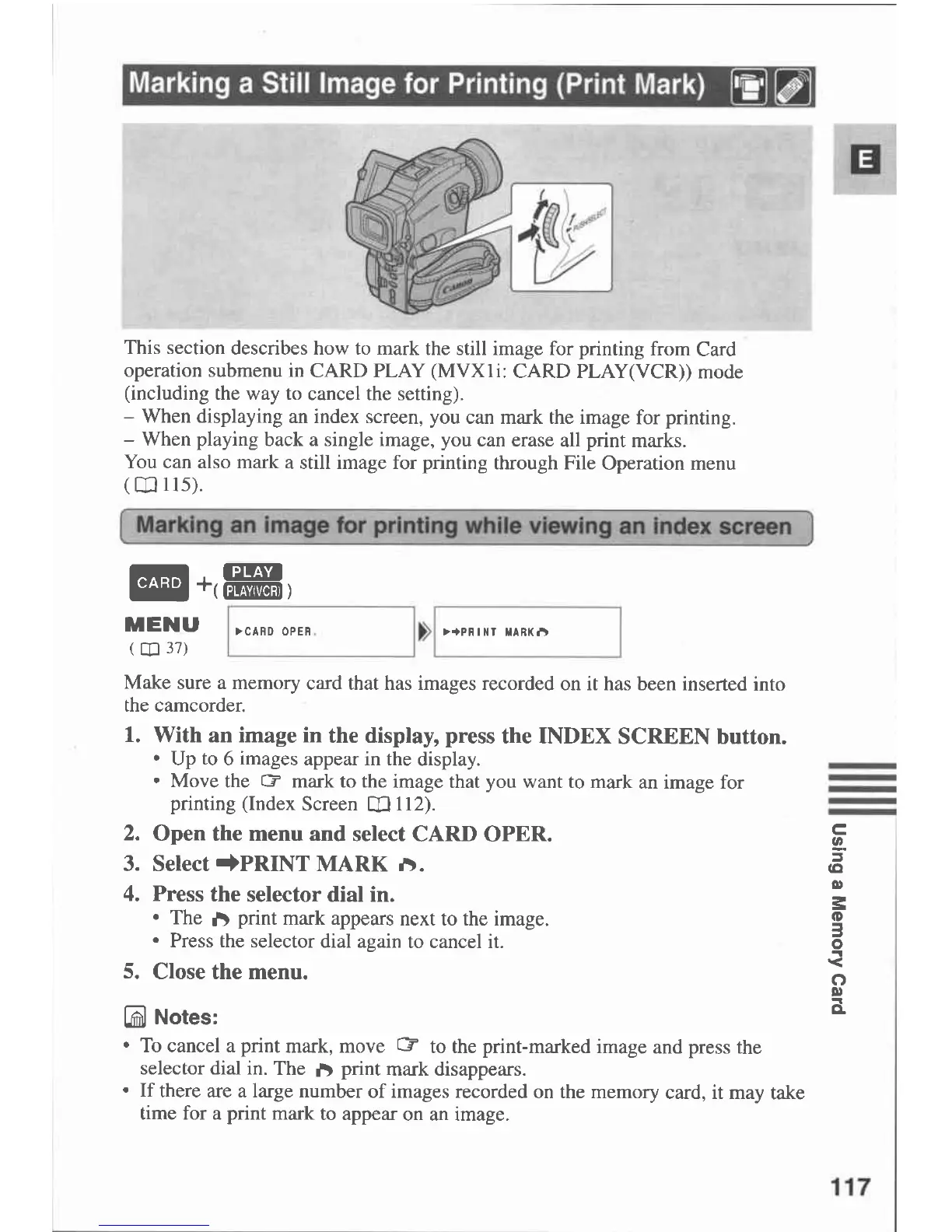 Canon MVX 1 - Making a Still Image for Printing; Marking an Image for Printing While Viewing an Index Screen