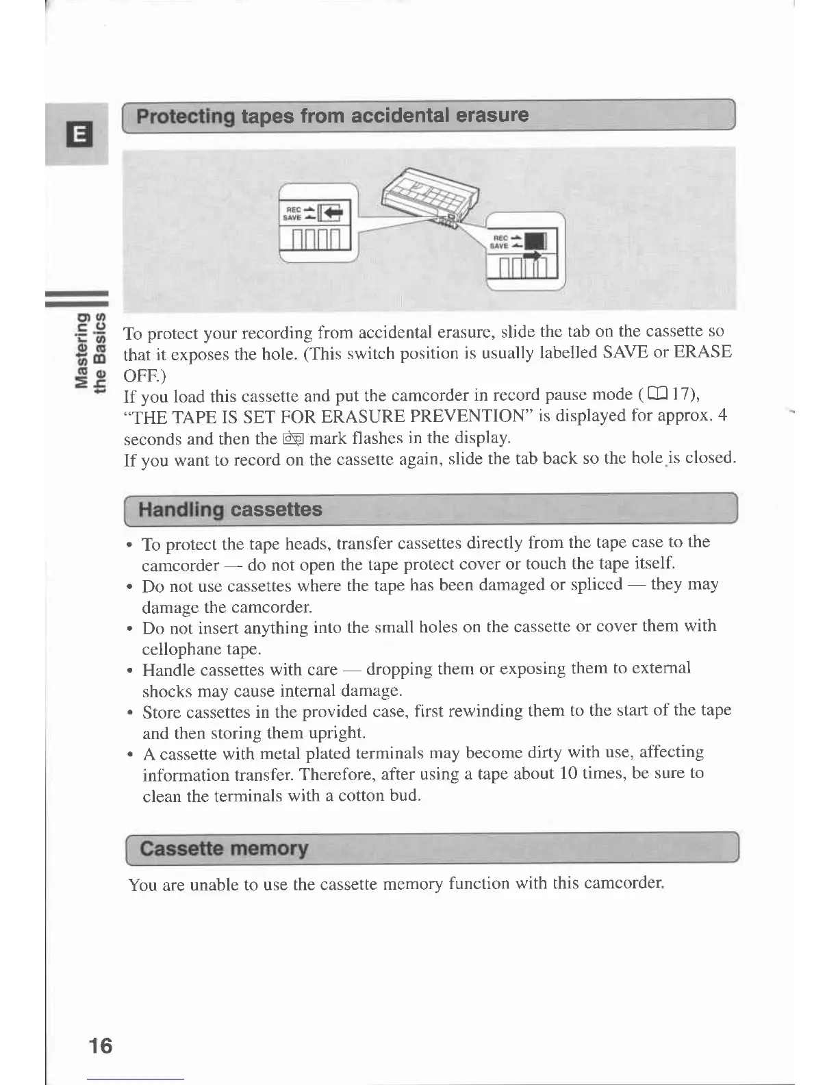 Canon MVX 1 - Protecting Tapes from Accidental Erasure; Handling Cassettes; Cassette Memory