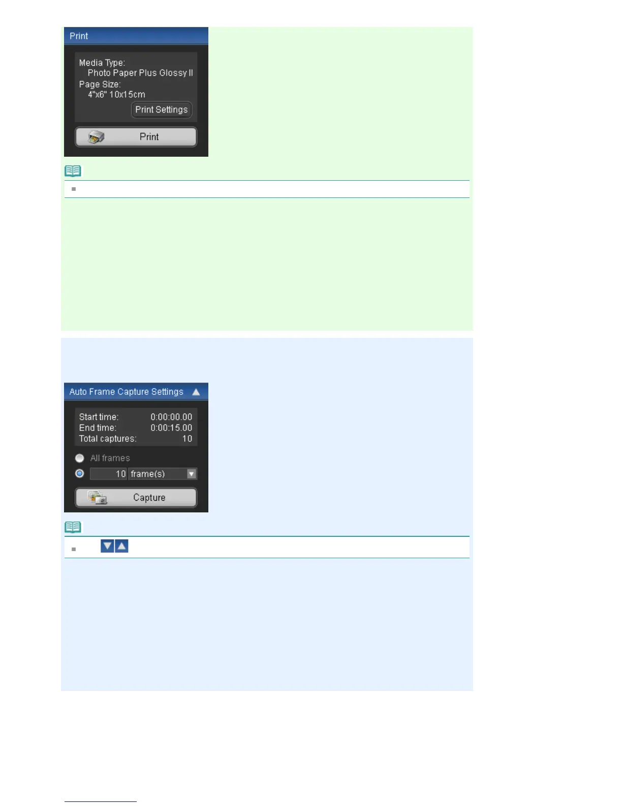 Starts printing the still images selected in the Captured frame(s) area.