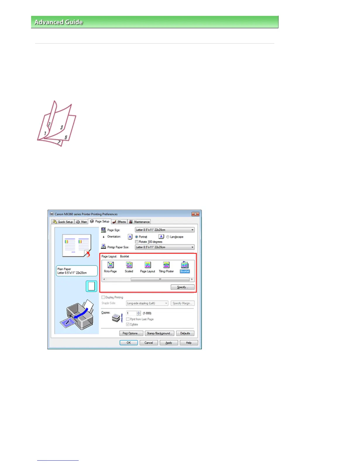 Click Specify... and specify the following settings in the Booklet Printing dialog box, and then click