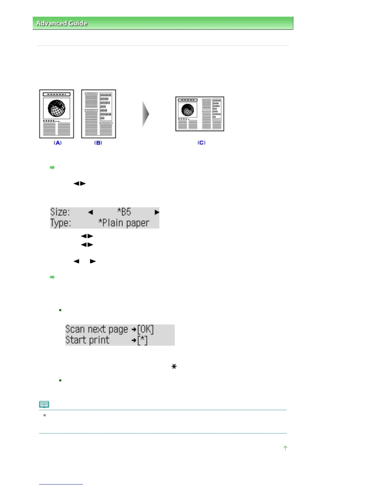 You can copy two original pages (A) (B) onto a single sheet of paper (C) by reducing each image.