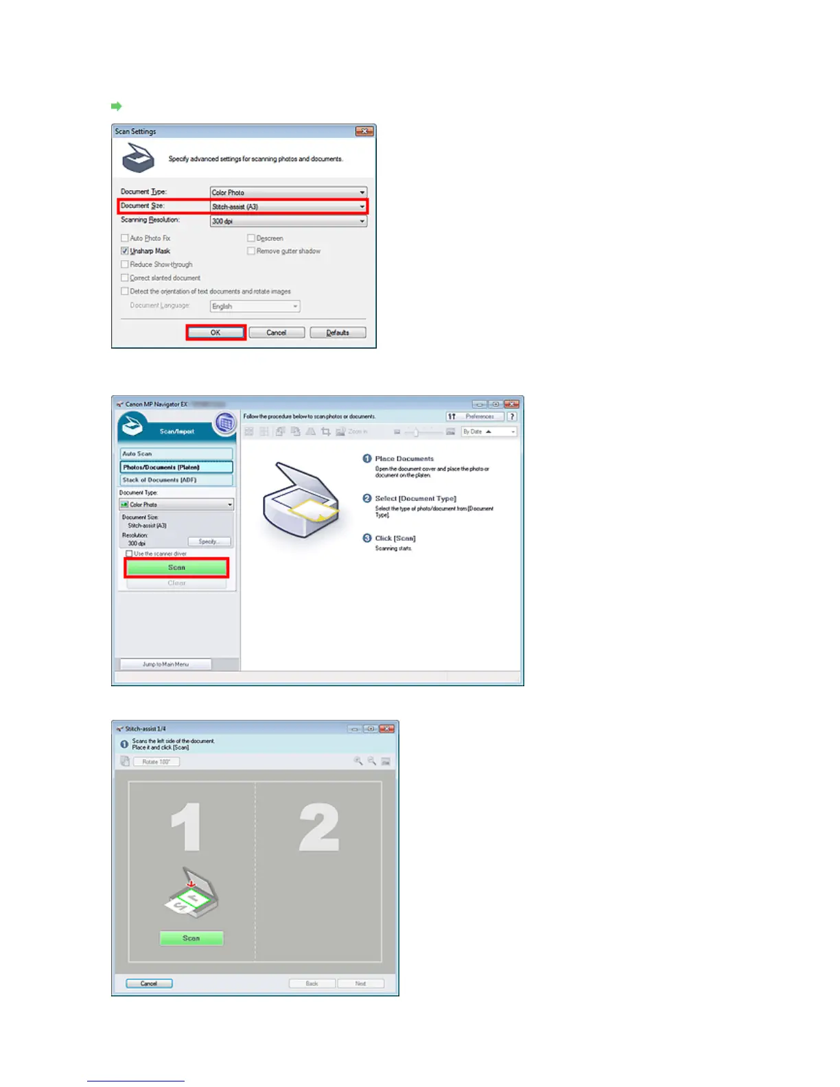 Select Stitch Assist for Document Size, then specify the scanning resolution as required.