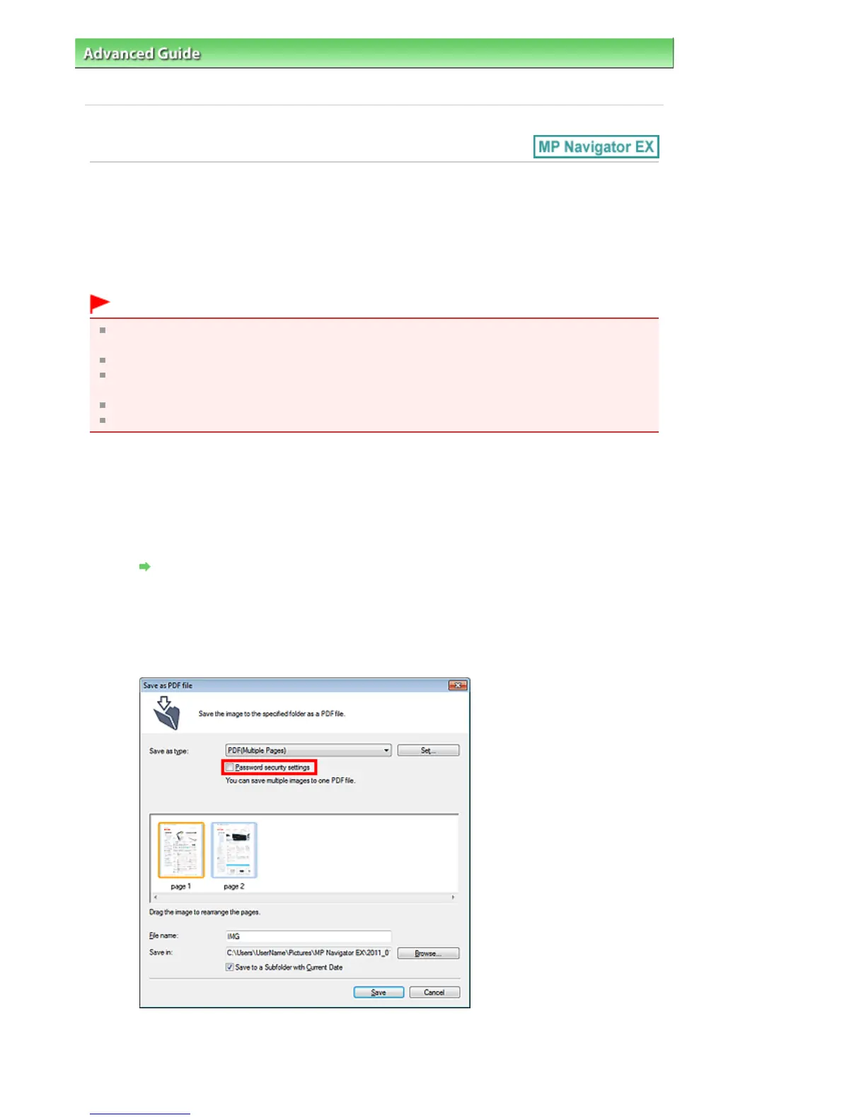 Open the password setting screen from images scanned into MP Navigator EX or