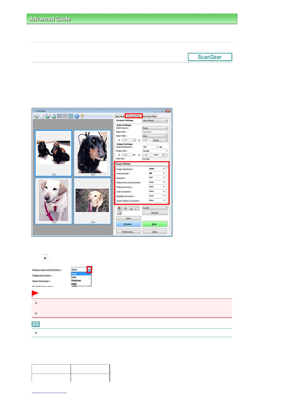 Adjusting Colors with ScanGear (Scanner Driver) > Correcting Images (Unsharp Mask, Reduce Dust and