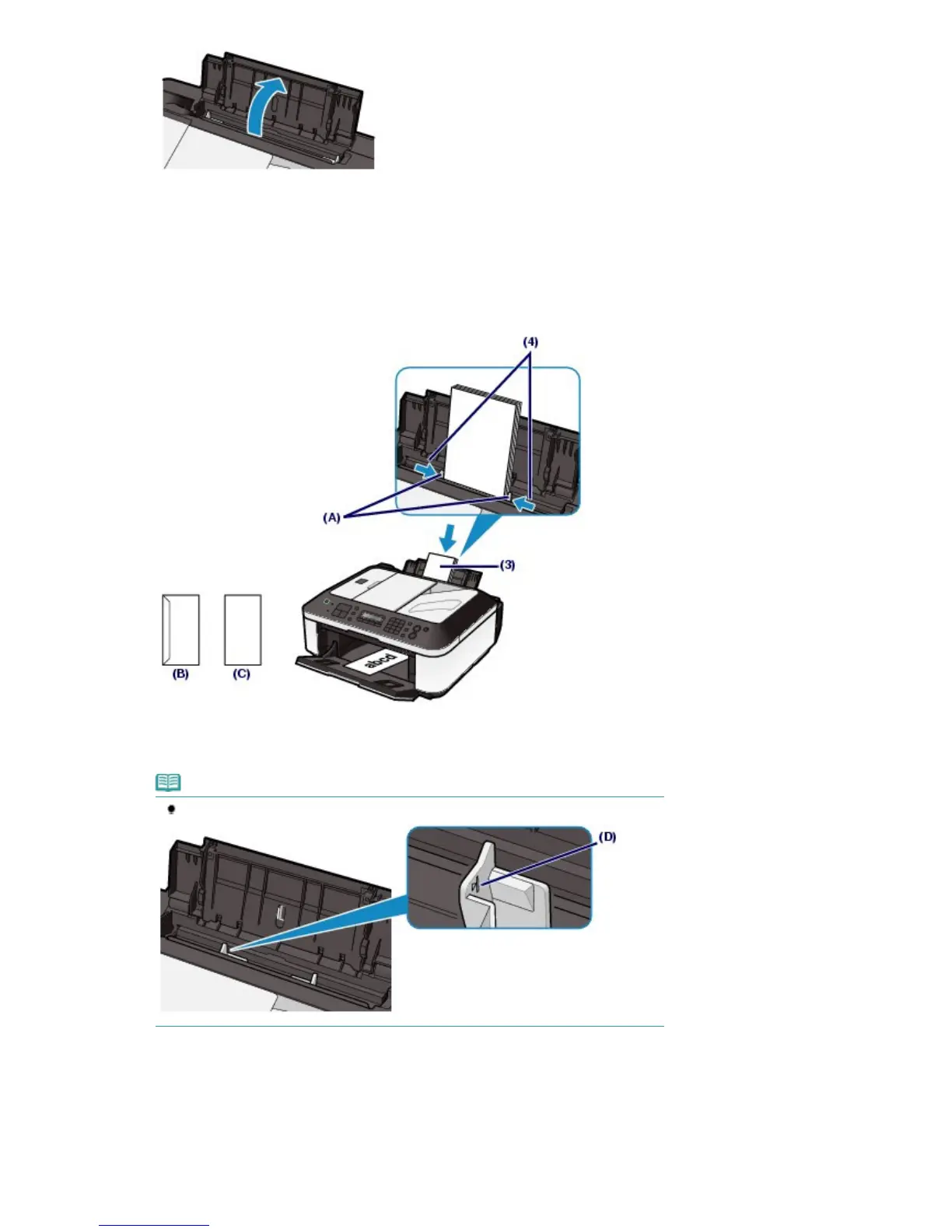 Slide the Paper Guides (A) to open them, and load the envelopes in the center of