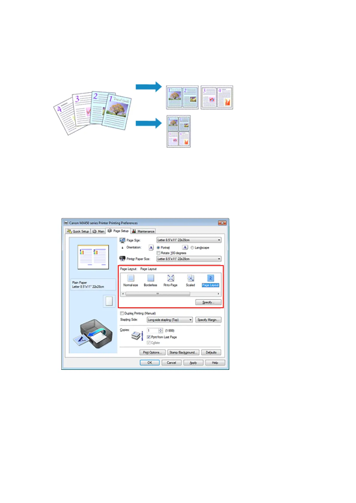 The page layout printing function allows you to print more than one page image on a single sheet of paper.